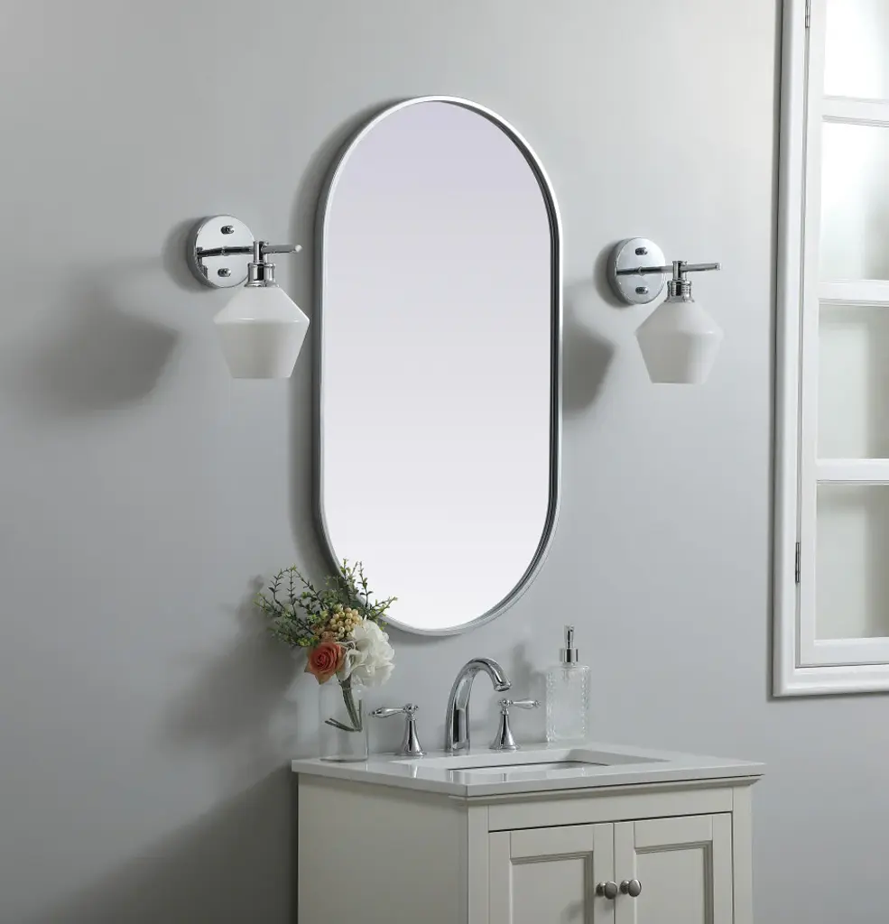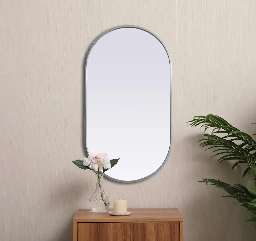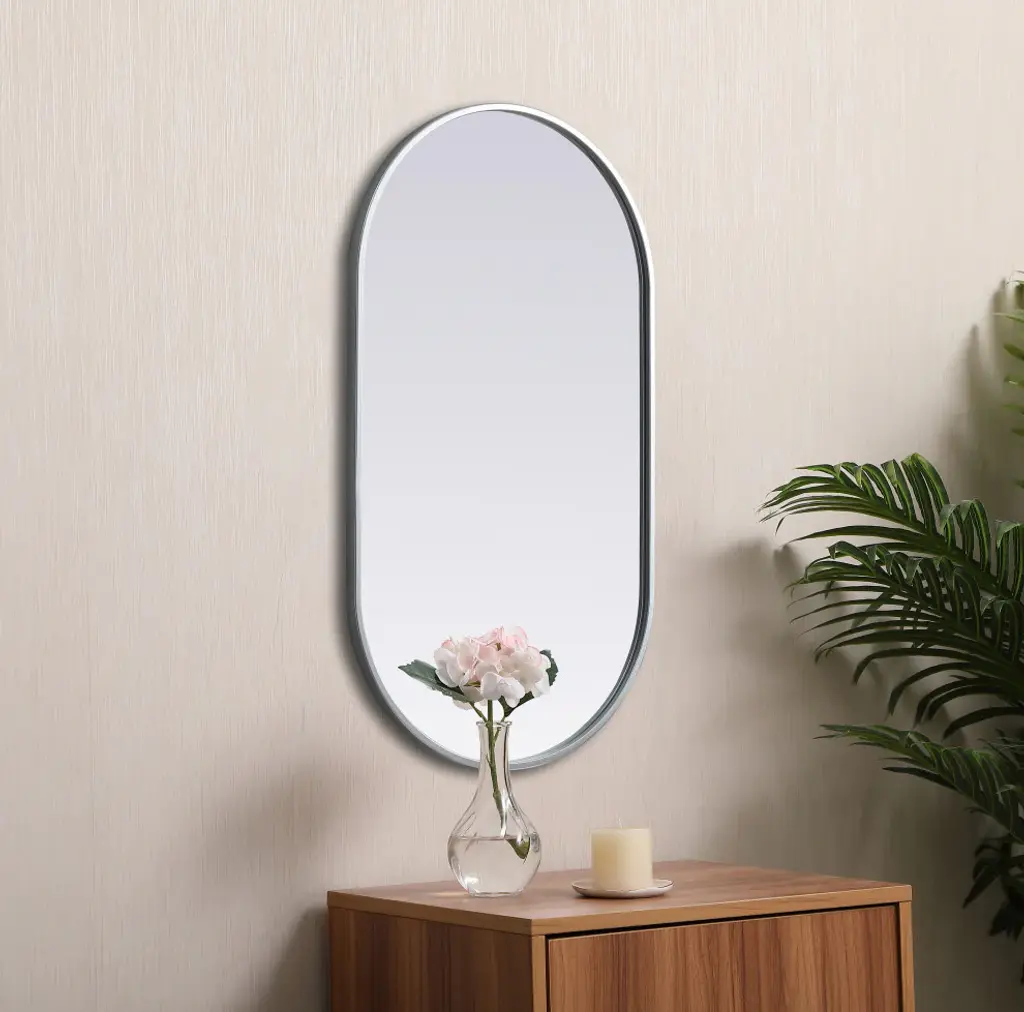 Instantly open up any space in your home with this minimalist wall-mounted mirror. Crafted of metal, this mirror strikes a pill-shaped silhouette. Its slender, clean-lined frame sports a classic finish, while the glass mirror within features a flat, for a brilliant reflection, letting the light bounce off to expand your space. Designed in a pill shape, this metal-frame mirror showcases in the three available satin finishes in black, brass, or silver. Mount this work of art in any room of your choice for added visual impact.Modern pill-shaped silhouette mirror is an architectural accent in your home. the mirror comes with a solid MDF board backing and three welded keyhole hanger for easy installationMirror is recessed into the ultra-thin iron sturdy metal frameperfect accent mirror to add visual interest and depth to your bedroom, living room, bathroom, entry way or any room!can be mounted both in a vertical or horizontal orientationmirror arrives at your home in one piece with no installation requiredglass insert measures 19.22 inch wide X 0.15 inch deep X 35.22 inch high