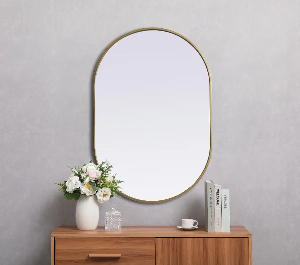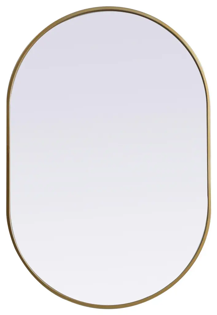 Instantly open up any space in your home with this minimalist wall-mounted mirror. Crafted of metal, this mirror strikes a pill-shaped silhouette. Its slender, clean-lined frame sports a classic finish, while the glass mirror within features a flat, for a brilliant reflection, letting the light bounce off to expand your space. Designed in a pill shape, this metal-frame mirror showcases in the three available satin finishes in black, brass, or silver. Mount this work of art in any room of your choice for added visual impact.Modern pill-shaped silhouette mirror is an architectural accent in your home. the mirror comes with a solid MDF board backing and three welded keyhole hanger for easy installationMirror is recessed into the ultra-thin iron sturdy metal frameperfect accent mirror to add visual interest and depth to your bedroom, living room, bathroom, entry way or any room!can be mounted both in a vertical or horizontal orientationmirror arrives at your home in one piece with no installation requiredglass insert measures 26.22 inch wide X 0.15 inch deep X 39.22 inch high