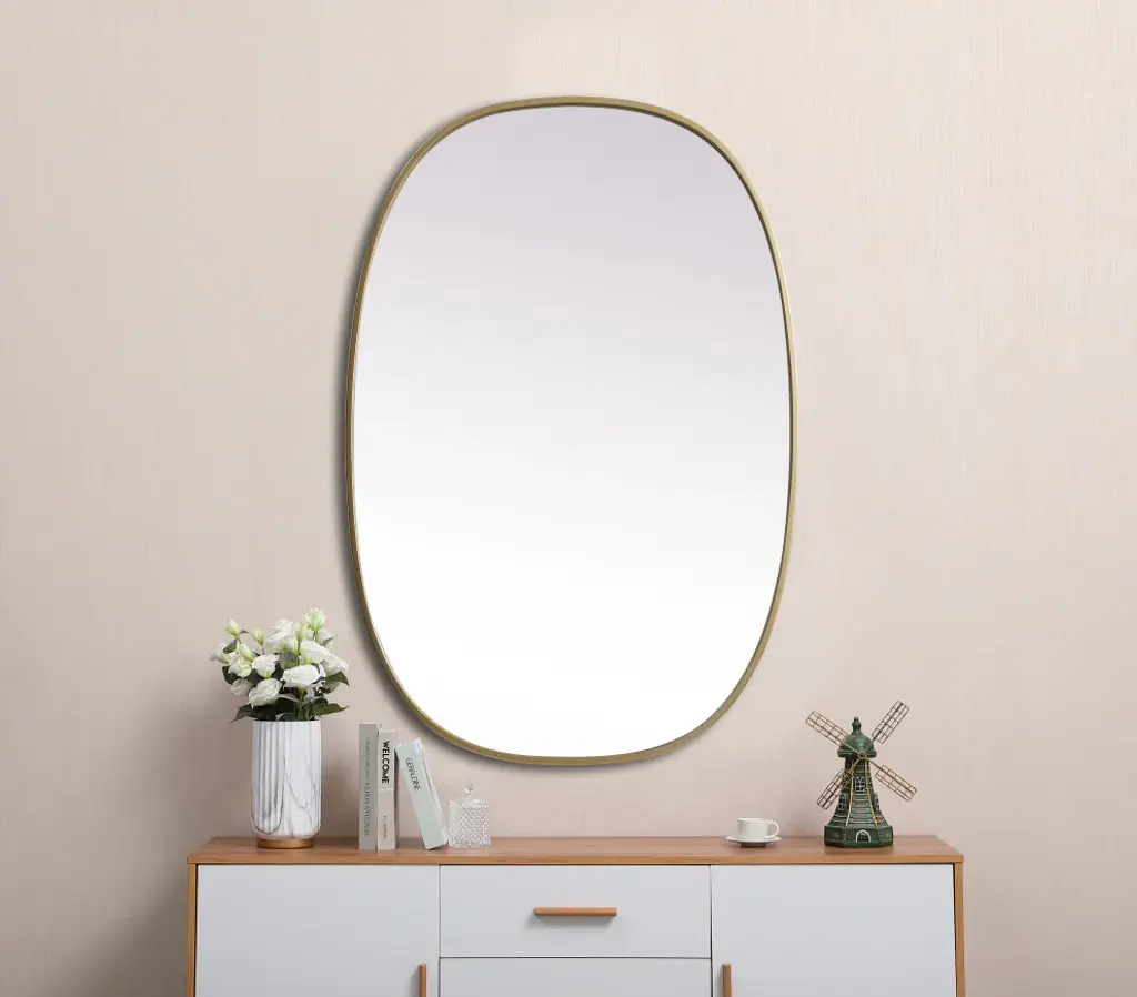 Crafted of metal, this mirror strikes a rounded corner silhouette. Instantly open up any space in your home with this minimalist wall-mounted mirror. Its slender, clean-lined frame sports a classic finish, while the glass mirror within features a flat, for a brilliant reflection, letting the light bounce off to expand your space. Designed in an oblong shape, this metal-frame mirror showcases in the three available satin finishes in black, brass, or silver. Mount this work of art in any room of your choice for added visual impact.Simple oblong silhouette mirror looks effortlessly chic and glamorousthe mirror comes with a solid MDF board backing and three welded keyhole hanger for easy installationMirror is recessed into the ultra-thin iron sturdy metal frameperfect accent mirror to add visual interest and depth to your bedroom, living room, bathroom, entry way or any room!can be mounted both in a vertical or horizontal orientationmirror arrives at your home in one piece with no installation requiredglass insert measures 26.22 inch wide X 0.15 inch deep X 39.22 inch high