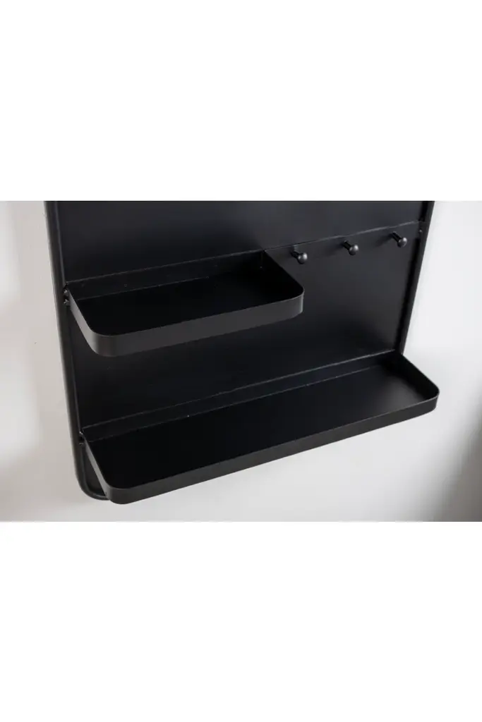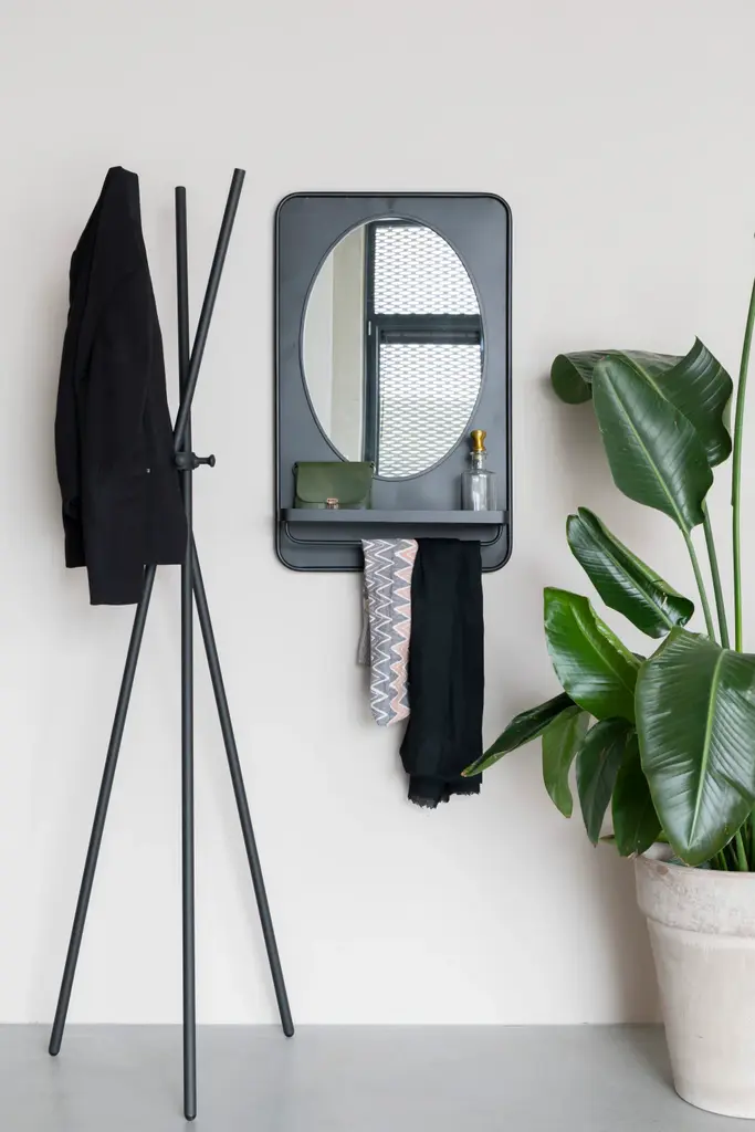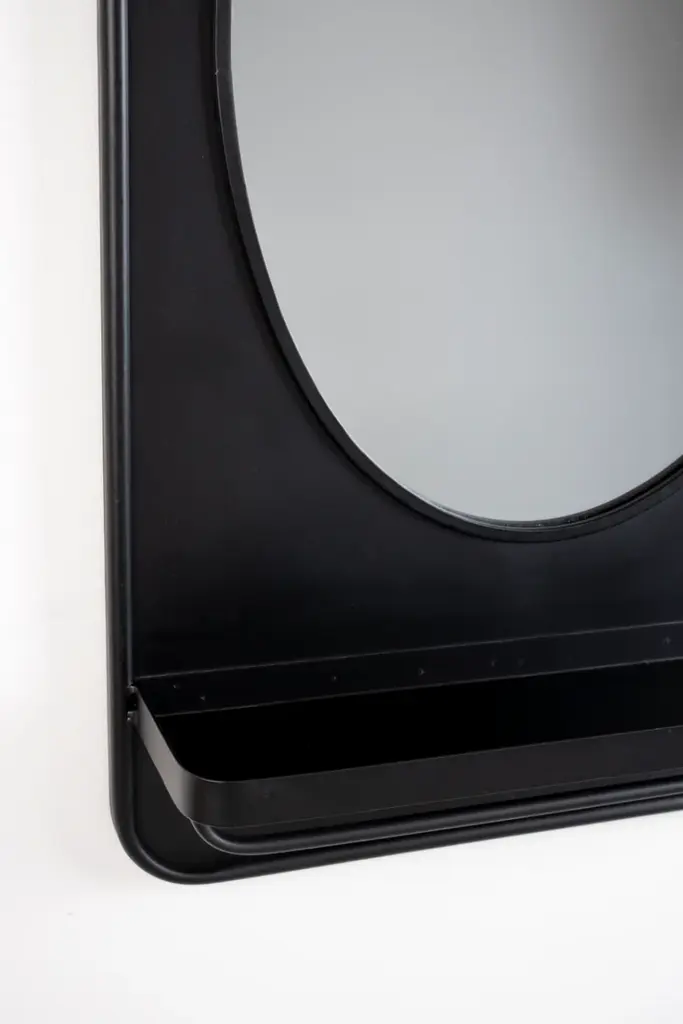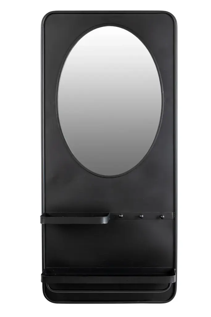 Mirror shelf Pascal by DF offers a casual yet modern outline. The oval mirror is set against a black iron back drop with rack and an open shelf.
