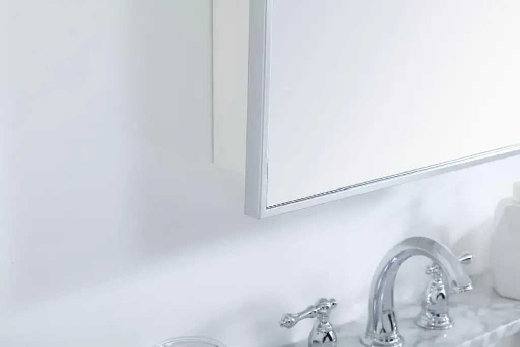 Home Living medicine cabinet reflects a minimalist''s design and trendy styling with its rust-free metal frame mirror. The classic clean and straight lines of this rectangular mirror provide you with a timeless and elegant look in your bathroom, featuring an ultra-thin metal frame in deep profile, reflecting a minimalist''s design and industrial styling. Open its door to the left or right to reveal two adjustable glass shelves for storing your toiletries. There are four metal keyhole hangers installed on the back of the mirror for easy installation, mounting hardware is not included. Constructed with a manufactured wood frame for exceptional strength and durability.comes with two glass shelves6 levels to adjust your shelf heightmirror cabinet can be installed either to have the door swing to the left or rightconvenient precut slits in the cabinet to adjust the shelf height4 inch storage depthfour keyhole hanging mechanism, mounting hardware is not includedfully assembled and ready to be installed
