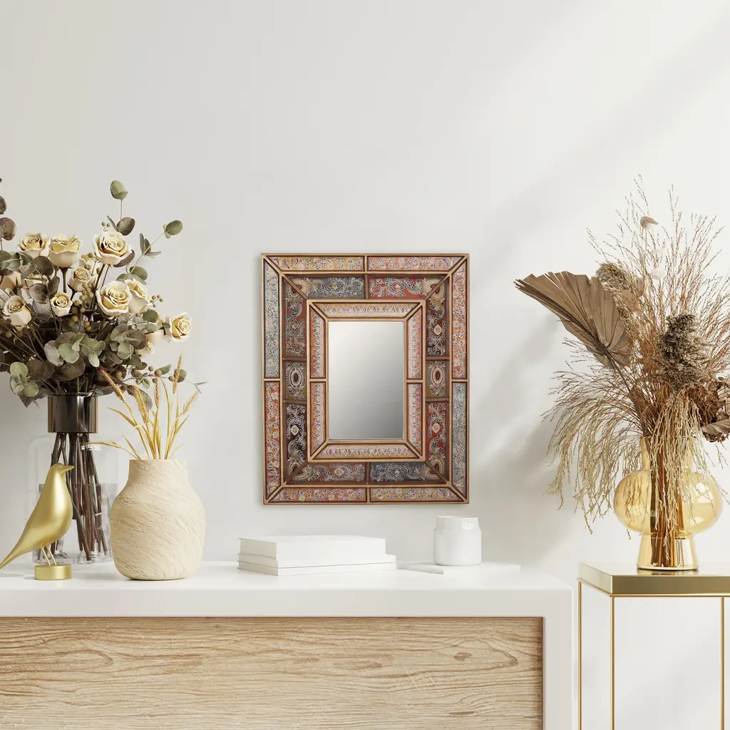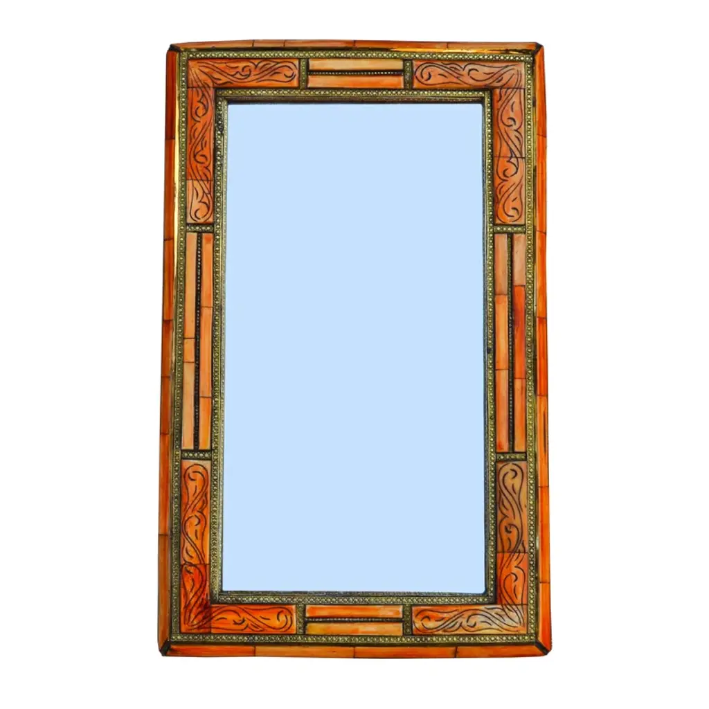 Breathtaking in its simplicity, this large Venetian style mirror is crafted of wood and showcases a hand painted decoration of white flowers in a contoured, orange frame that stand out on a soft sky-blue background. A truly unique and elegant piece, the antiqued finish evokes the original charm of 18th century styles while maintaining a modern look. This interesting combination makes a great statement in an entryway, living room or bedroom. Size, color and motif can be personalized upon request and the mirror can be offered also in antiqued finish.