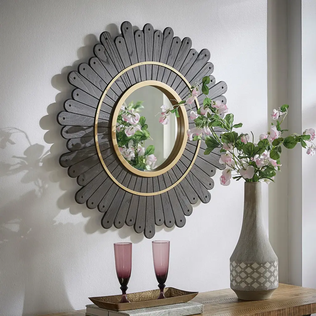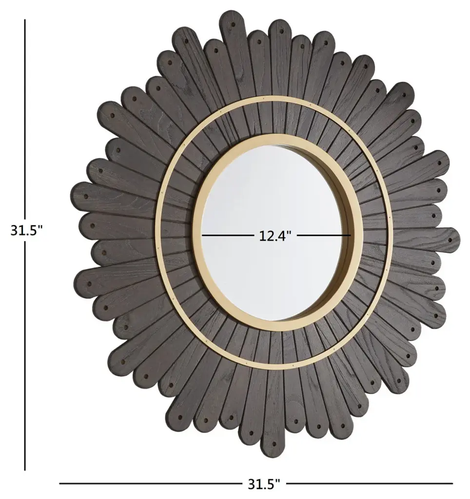 Add a showstopper to your home decor with the addition of the Round Dark Brown Sunburst Wall Mirror. A round, wooden frame comes in a striking, dark brown finish and sunburst design. Gold accents contrast the rich finish and add styled detail to the overall piece. Whether you hang it in your living room, dining room, or hallway, this stylish mirror is sure to charm all who gaze at it.