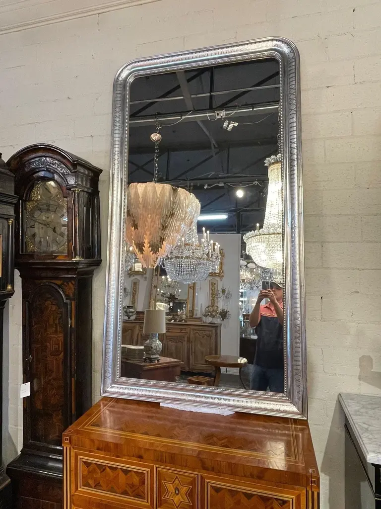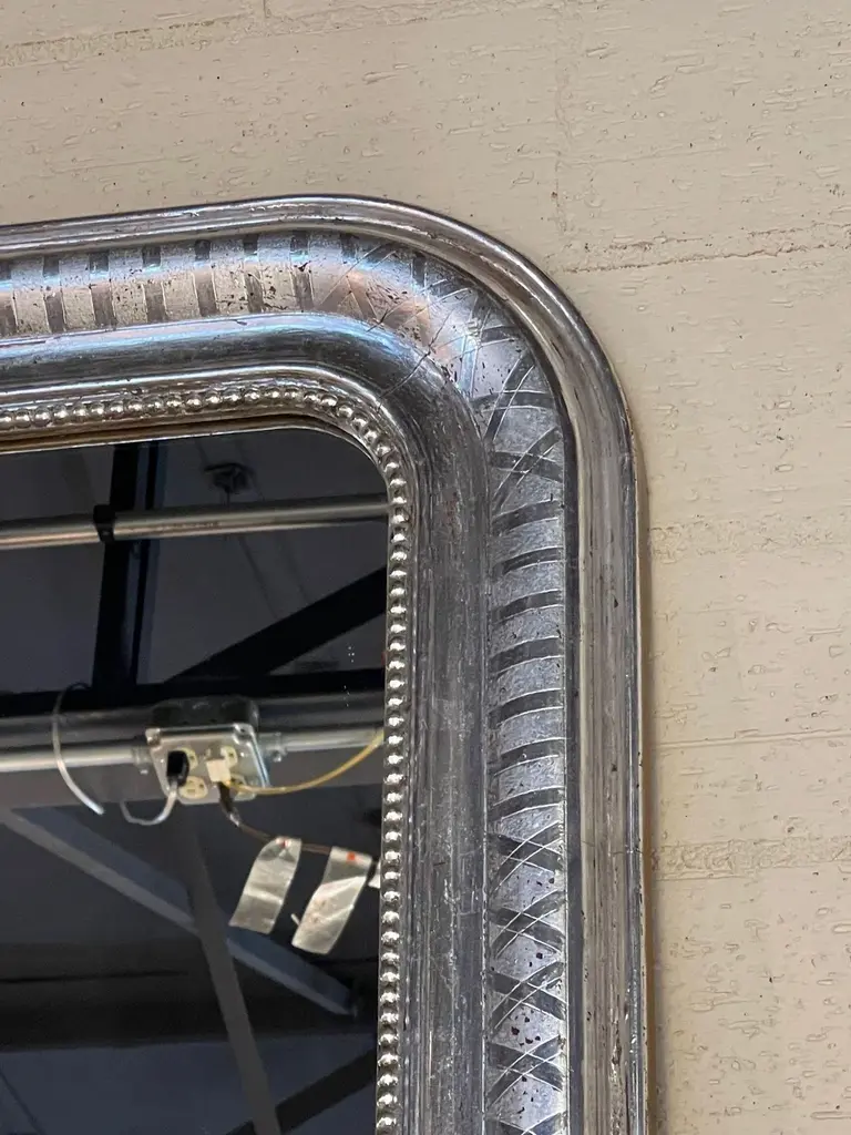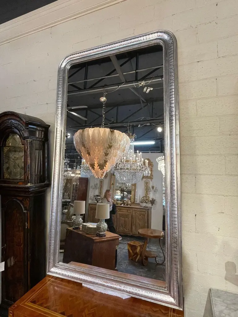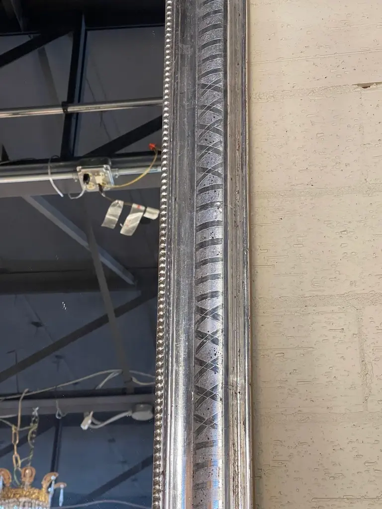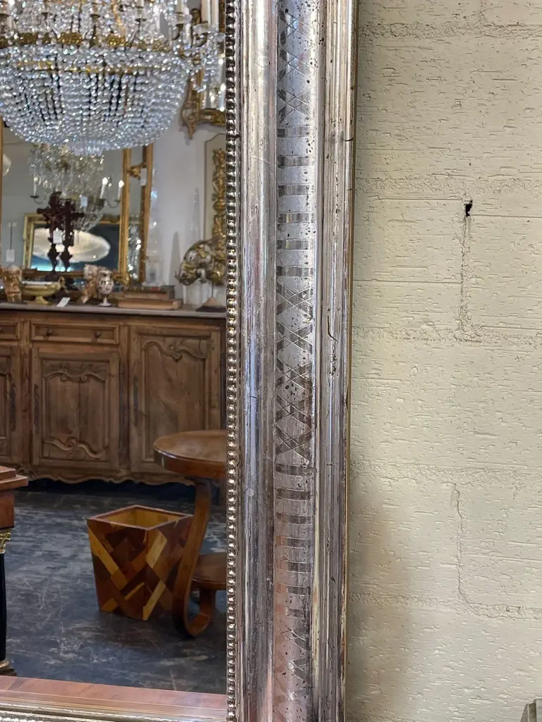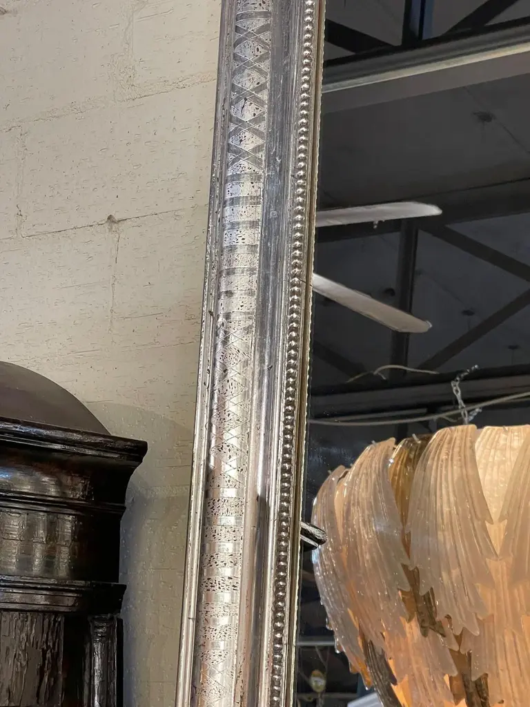 Very fine pair of large scale silver leaf Louis Philippe mirrors with X pattern. Beautiful beaded inner border as well. Makes an impressive statement!