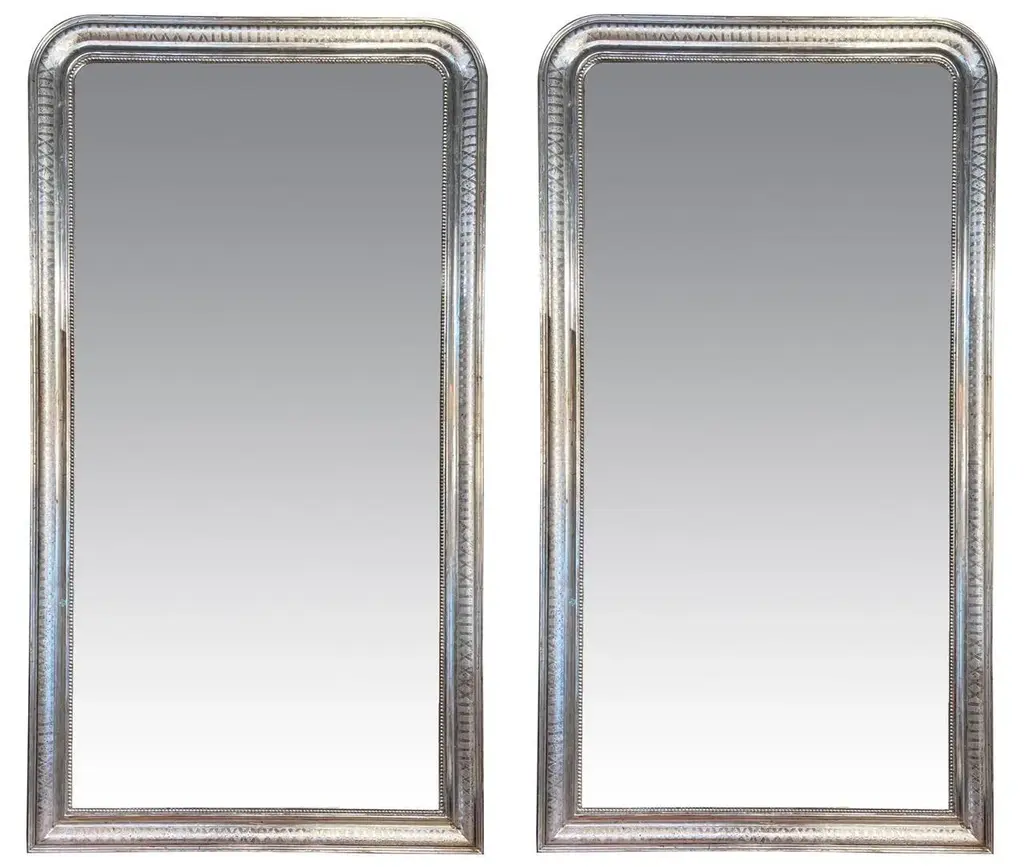 Mid 20th Century Large Scale Silver Leaf Louis Philippe Mirrors With X Pattern- A Pair