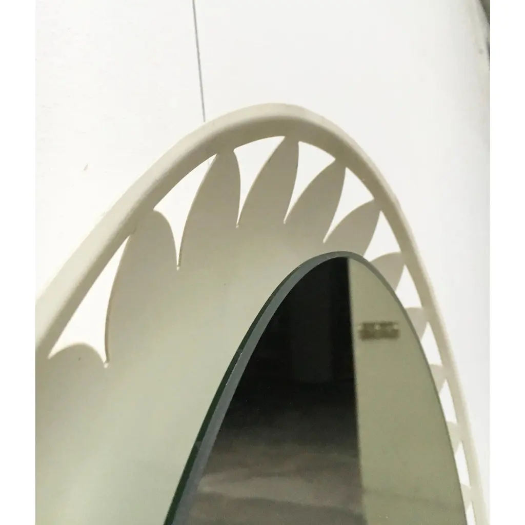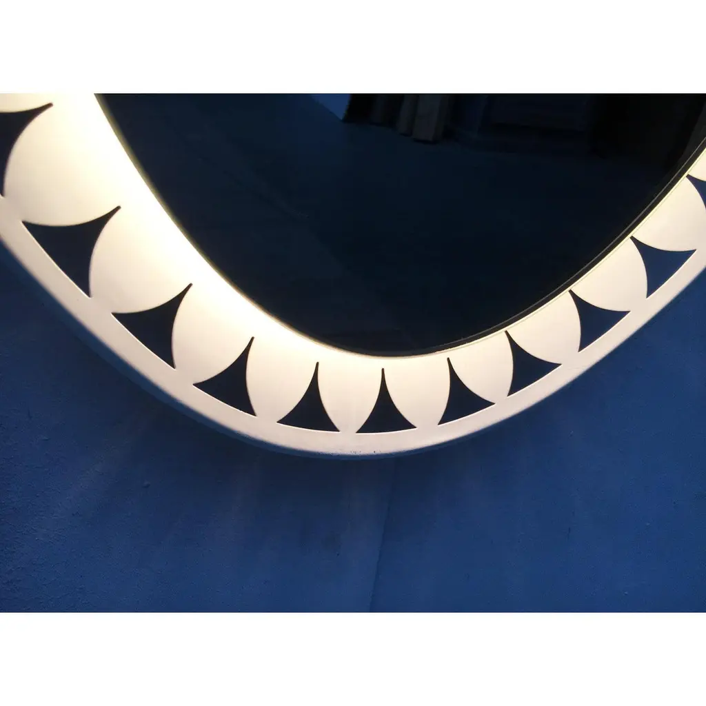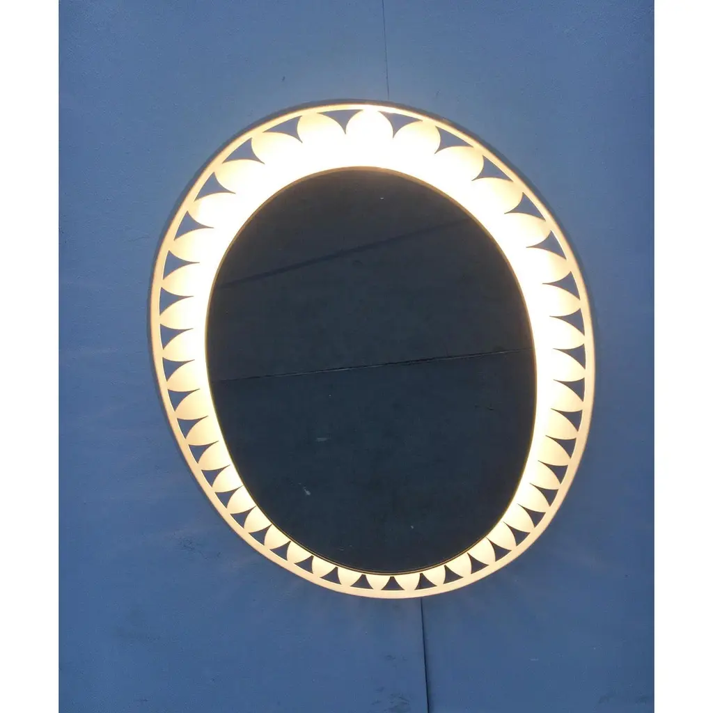 The mirror consists of two elements, the tub of metal for wall mounting and as a reflector for the emerging light and the mirror surface. The reflector tub is made of painted metal and has a reduced ''floral'' pattern around the edge. The pattern is punched out of the plate. The actual mirror surface is simply hung from the front with 2 hooks. Thus, the illuminants can be changed without any problems. Have official proof of authenticity such as vintage catalogs, designer records, or other literature sources.Additional information:Materials: MetalStyle: Mid-Century ModernPeriod: 1960sCountry of Origin: GermanyColor: WhiteItem Type: Vintage, Antique or Pre-ownedDimensions: 18.5ʺW × 2.36ʺD × 29.13ʺHCondition: Good Condition, Unknown, Some ImperfectionsCondition Notes: Patina Consistent with Age and Use