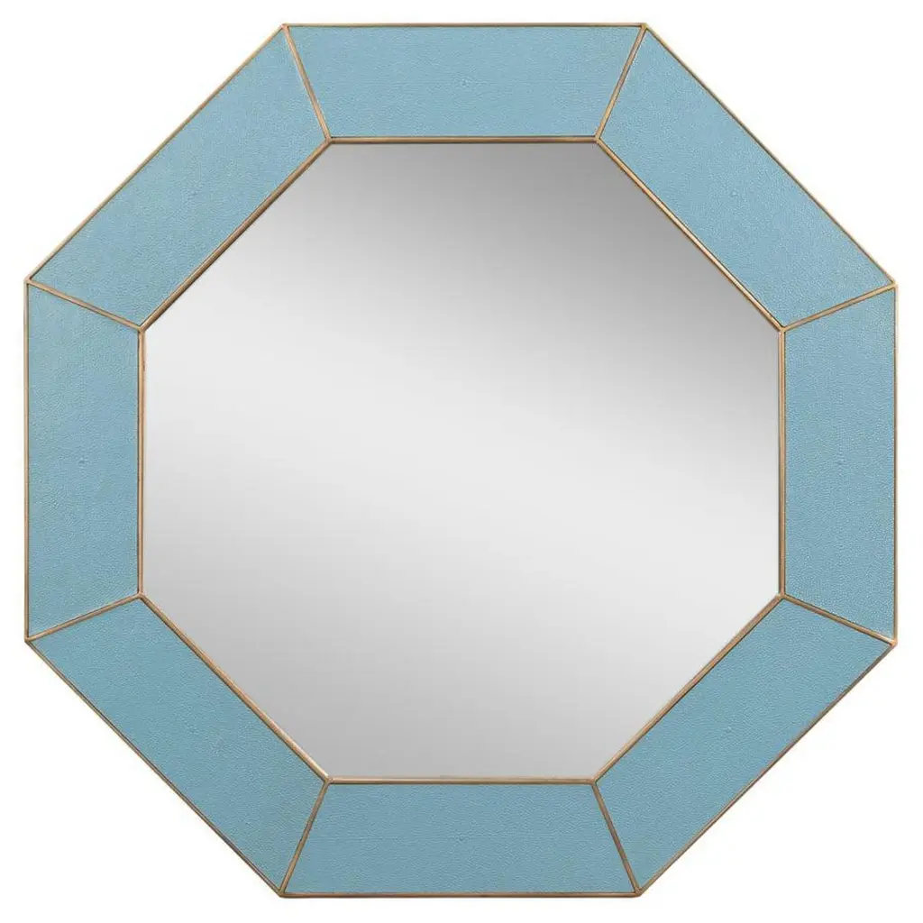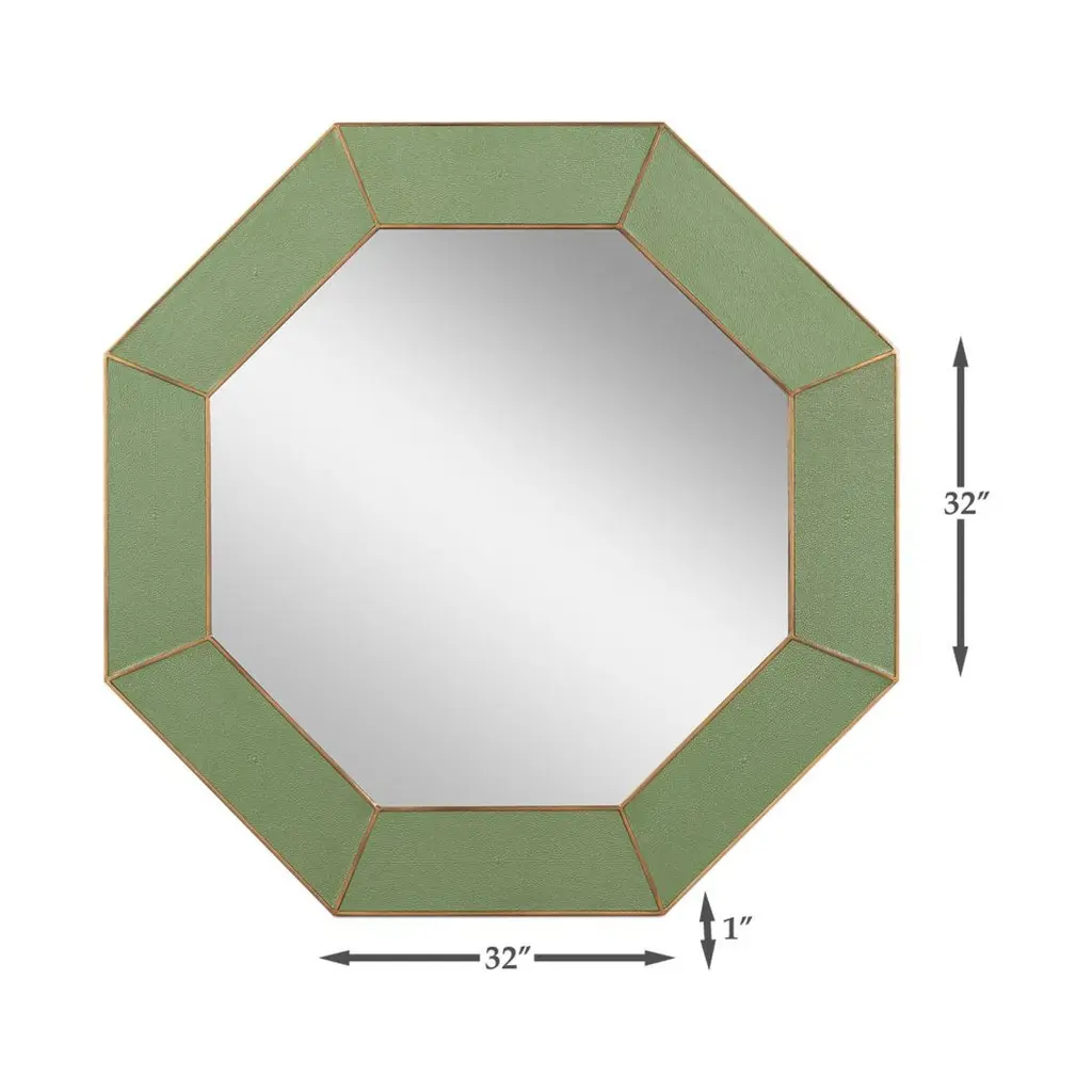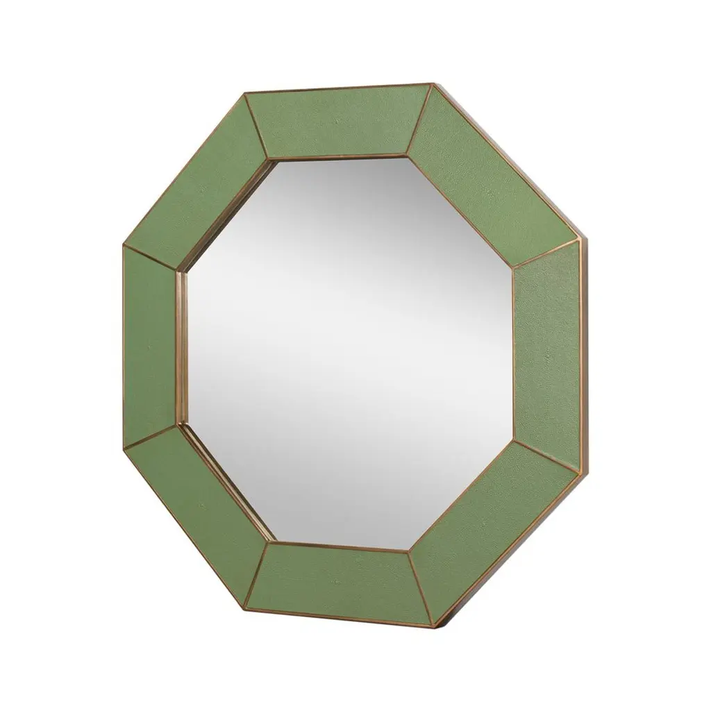 Wrapped in vibrant watercress green shagreen embossed leather, the frame is adorned with handcrafted gold accents, adding a touch of timeless sophistication. At its center, the beveled mirror enhances the design with added depth and a polished, luxurious finish.Perfect for modern interiors, contemporary spaces, or eclectic decor styles, this mirror serves as both a functional piece and a striking accent. Whether in a living room, entryway, or bedroom, the mirror brings texture, color, and artistic charm to any setting.Dimensions: 32" W x 32" H