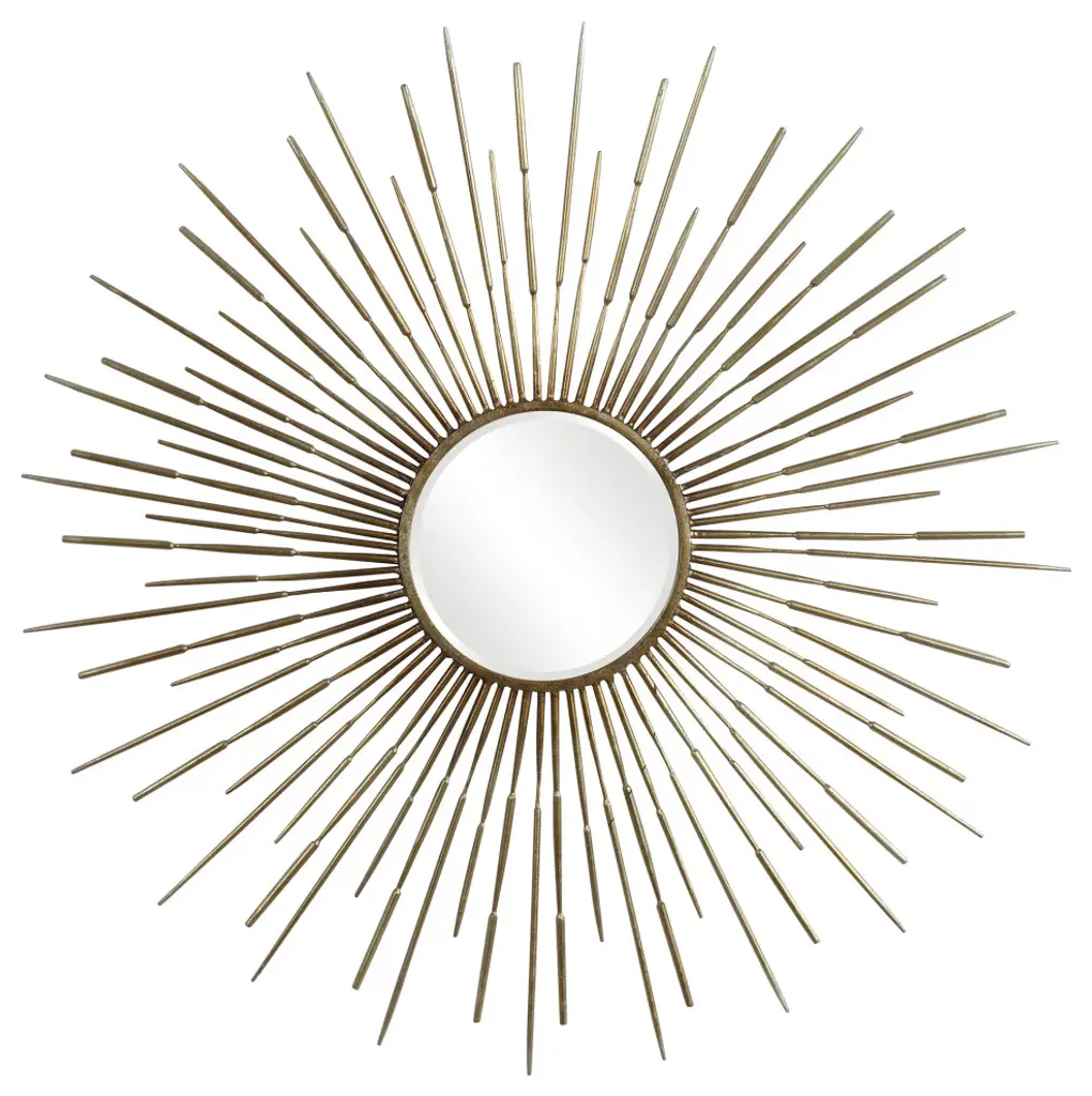 Inspired By Mid-century Designs, This Starburst Mirror Is Finished In An Antiqued Gold Leaf And Features A 1" Bevel.• 47" dia x 1" deep. Mirror Glass is 12.6" dia. Weighs 18 lbs.• Hand Finished Iron Frame• Properly weighted hanging hardware attached.• Heirloom Quality - Expertly hand crafted and hand finished. Due to the hand crafted nature of this piece, each piece may have subtle differences.