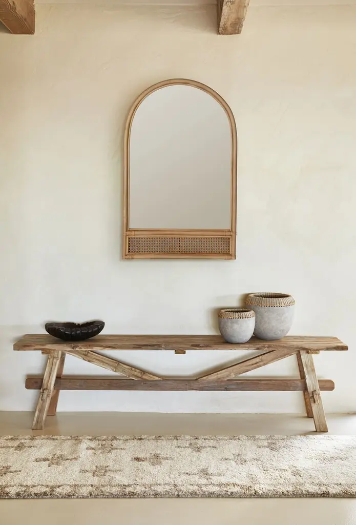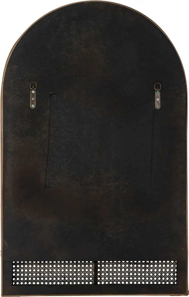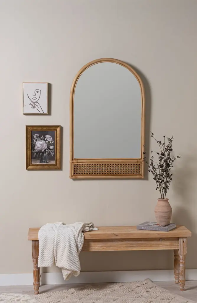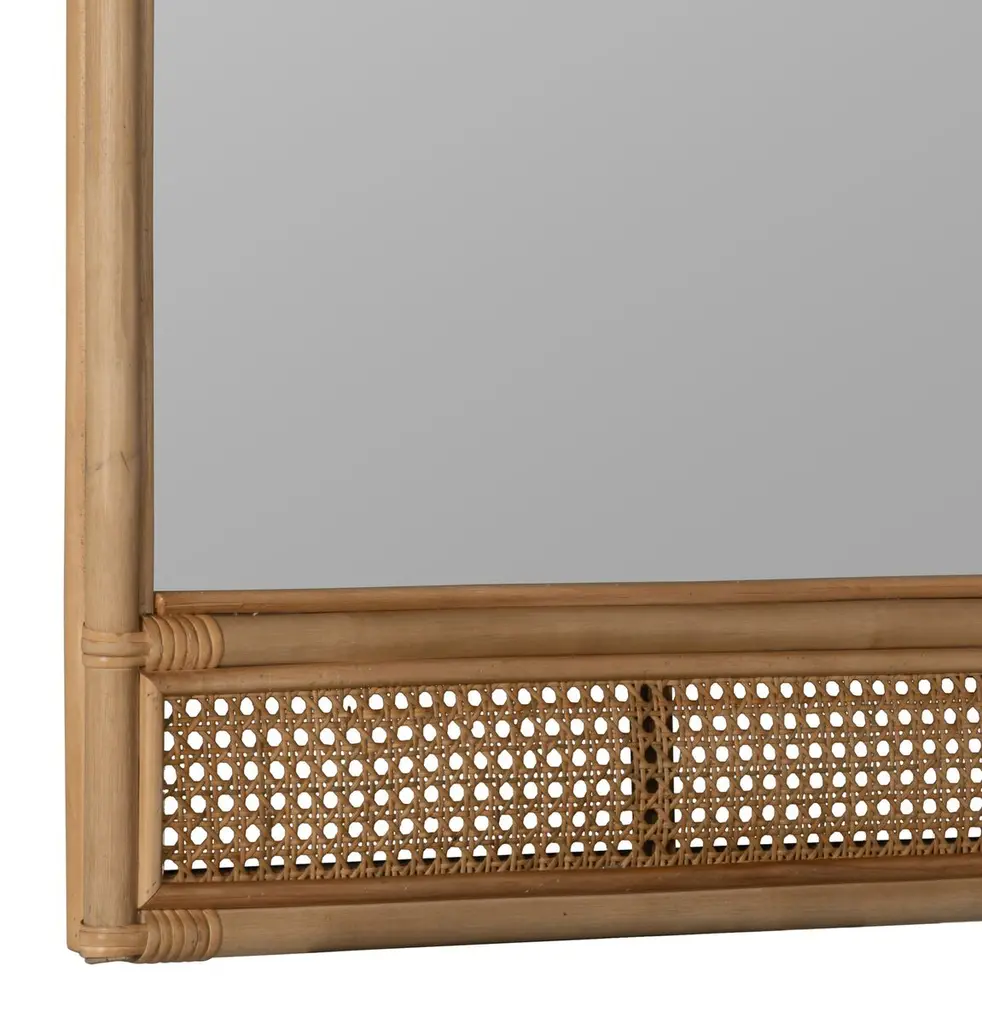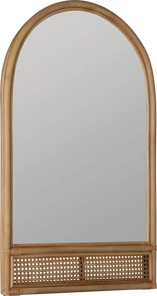 Cane inserts and leather bindings bring tropical panache to this arched mirror's bentwood frame.