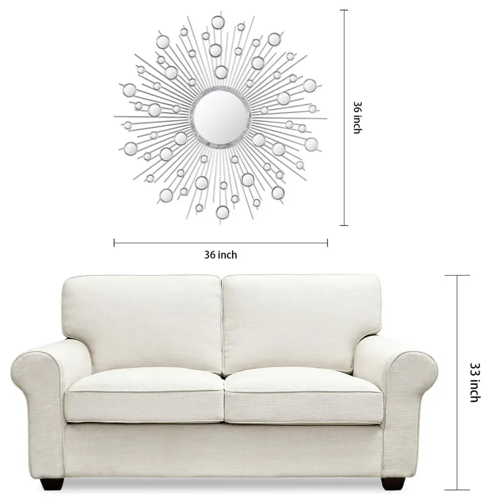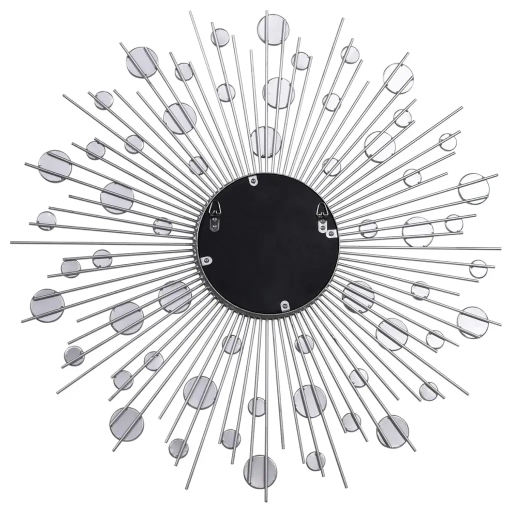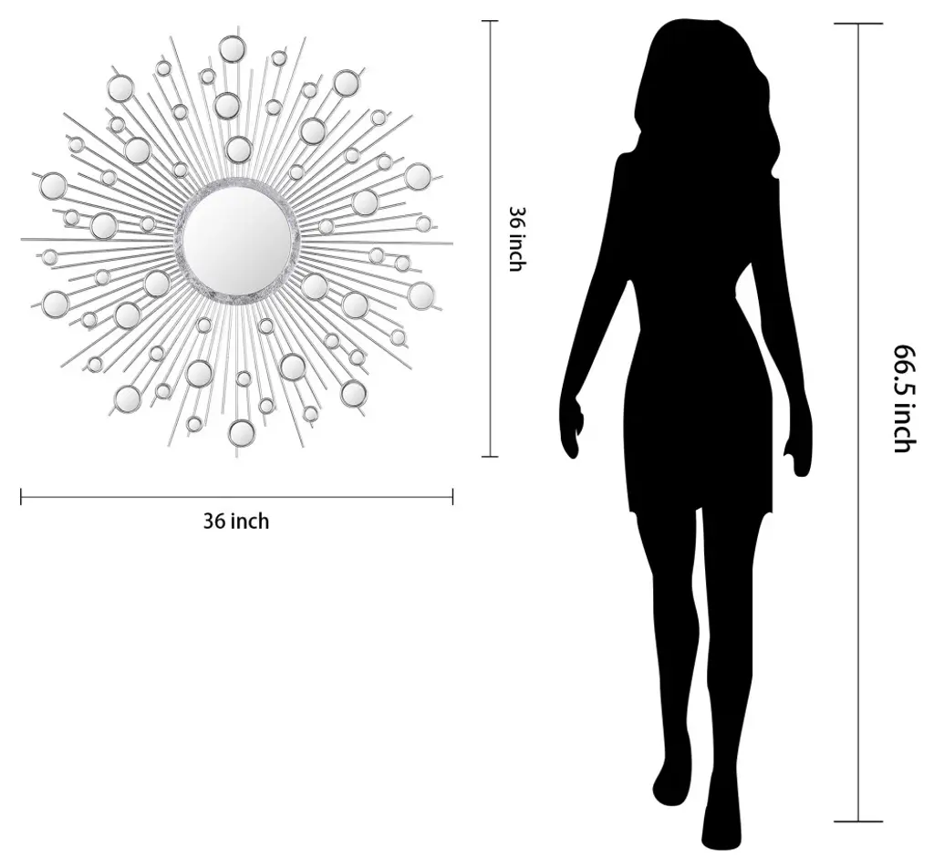 This 36" x 36" stunning wall mirror is constructed with a round glass mirror surrounded by many smaller acrylic mirrors to appear like a sunflower. Wrapped around the mirrors is a metal frame with handmade silver foil that intensifies the design of the sunflower and increases the elegance of the mirror.This wall mirror is ideal for adding more utility to a wall and enhancing the space of a room, making it feel larger and lighter. 2 D-rings are attached to the back of the mirror for quick and easy installation. Packaged in strong carton with full protective corners and styrofoam.