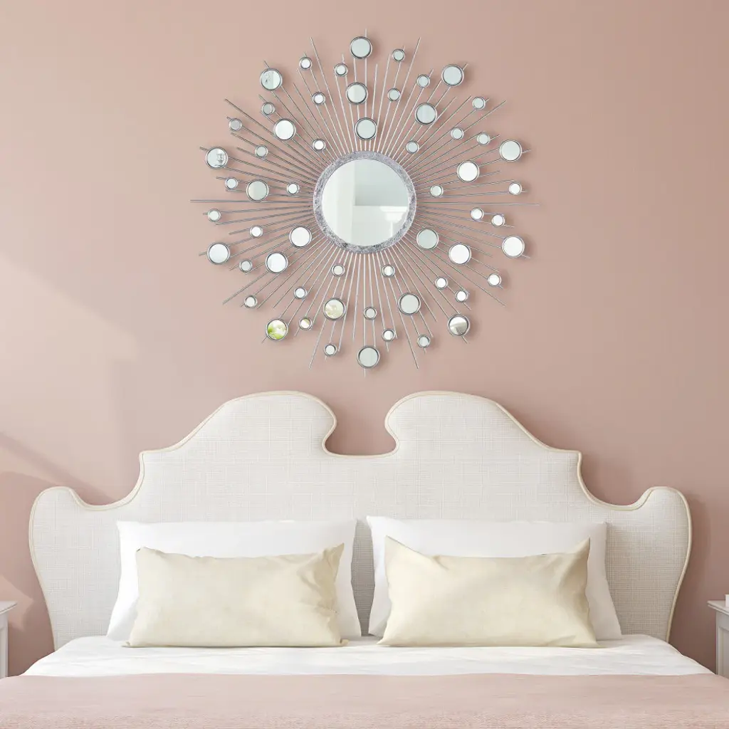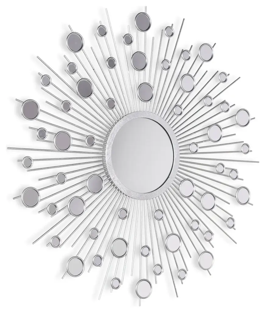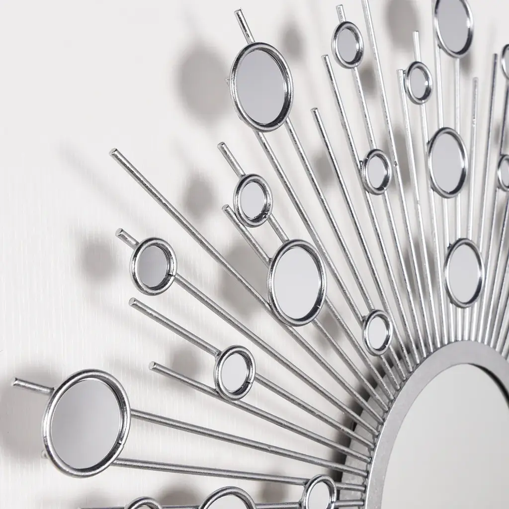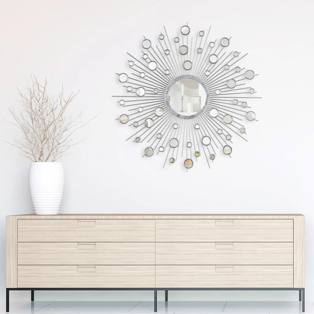 This 36" x 36" stunning wall mirror is constructed with a round glass mirror surrounded by many smaller acrylic mirrors to appear like a sunflower. Wrapped around the mirrors is a metal frame with handmade silver foil that intensifies the design of the sunflower and increases the elegance of the mirror.This wall mirror is ideal for adding more utility to a wall and enhancing the space of a room, making it feel larger and lighter. 2 D-rings are attached to the back of the mirror for quick and easy installation. Packaged in strong carton with full protective corners and styrofoam.