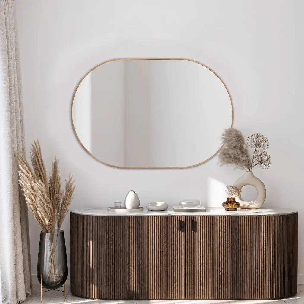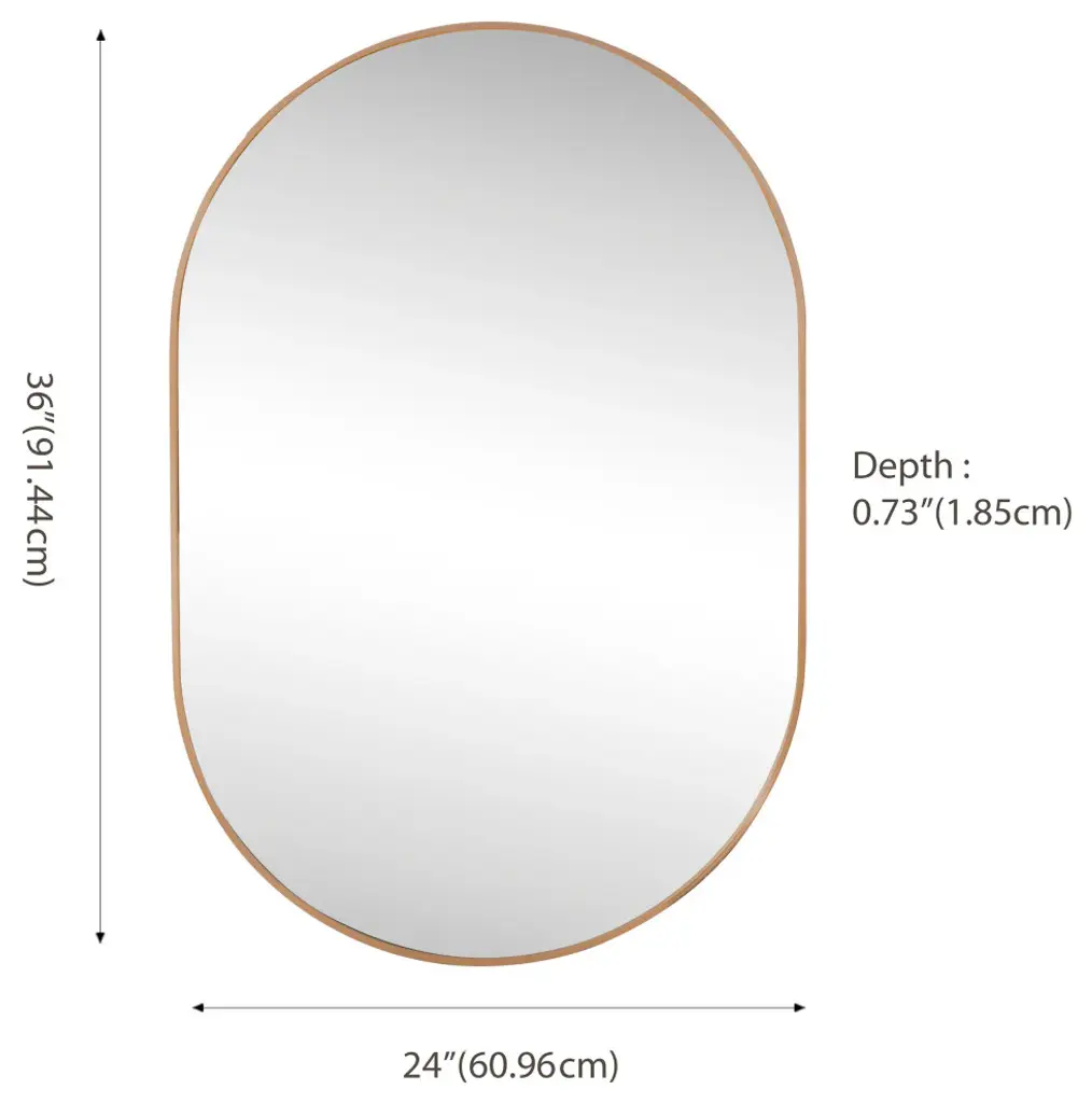 The classic oval shape of this modern vanity mirror is the perfect minimalist accent for any space. This versatile wall-hung design is strengthened by a narrow metal frame. Vertical or horizonal orientations are ideal for a bathroom vanity, Livingroom or entry area.Features:• Mirrored glass has a minimalist gold metal frame• Contemporary wide oval design visually expands your space• Add vintage style to a bedroom or living room with the gentle curves of this versatile mirror• Mounting Options: Equipped with hooks for flexible hanging, suitable for both vertical and horizontal orientations• Hanging device: MDF backboard• with • Mirror Orientation: Both• Body Material: Metal• 36 inches high x 24 inches wide x 0.73 inches deepAbout us:You see an ordinary mirror.We see an enhancement to help with making your fashionable statement.A perfectly smooth-edged frame with LED lighting and uniform surface casts a flaring reflection of the subject and surroundings. Our vast mirror catalog includes a variety of designs, shapes and sizes.JONATHAN Y Lighting - a fashion revolution in home decor.