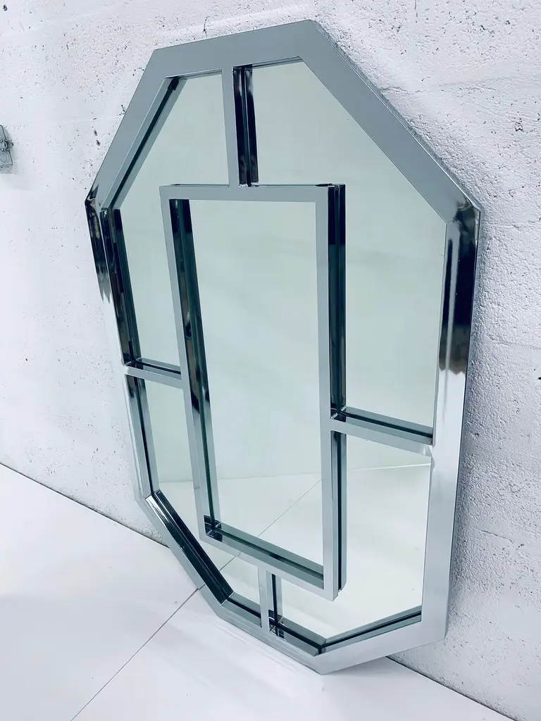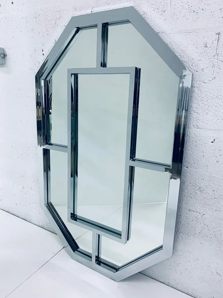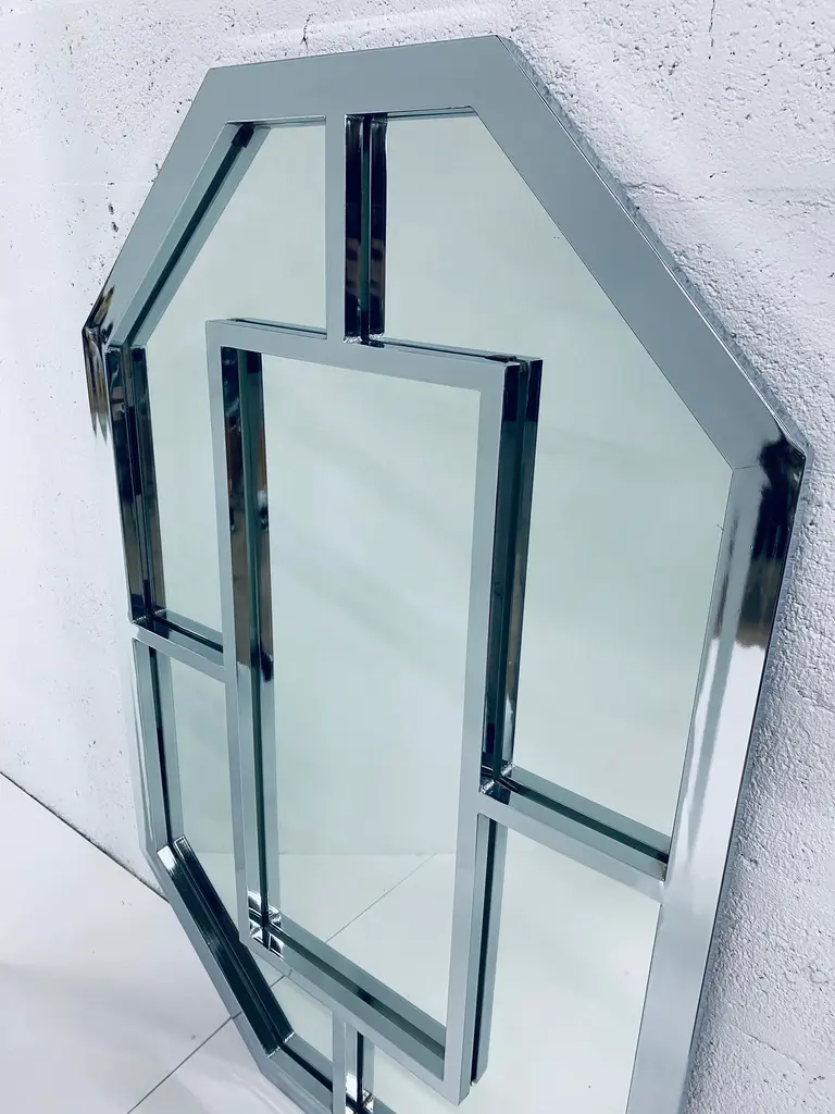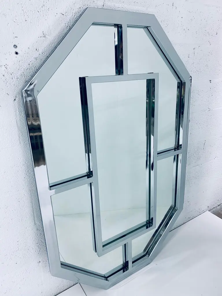 Mid-Century modern octagonal wall mirror with large polished chrome trellis frame by Milo Baughman for Thayer Coggin. Two available.