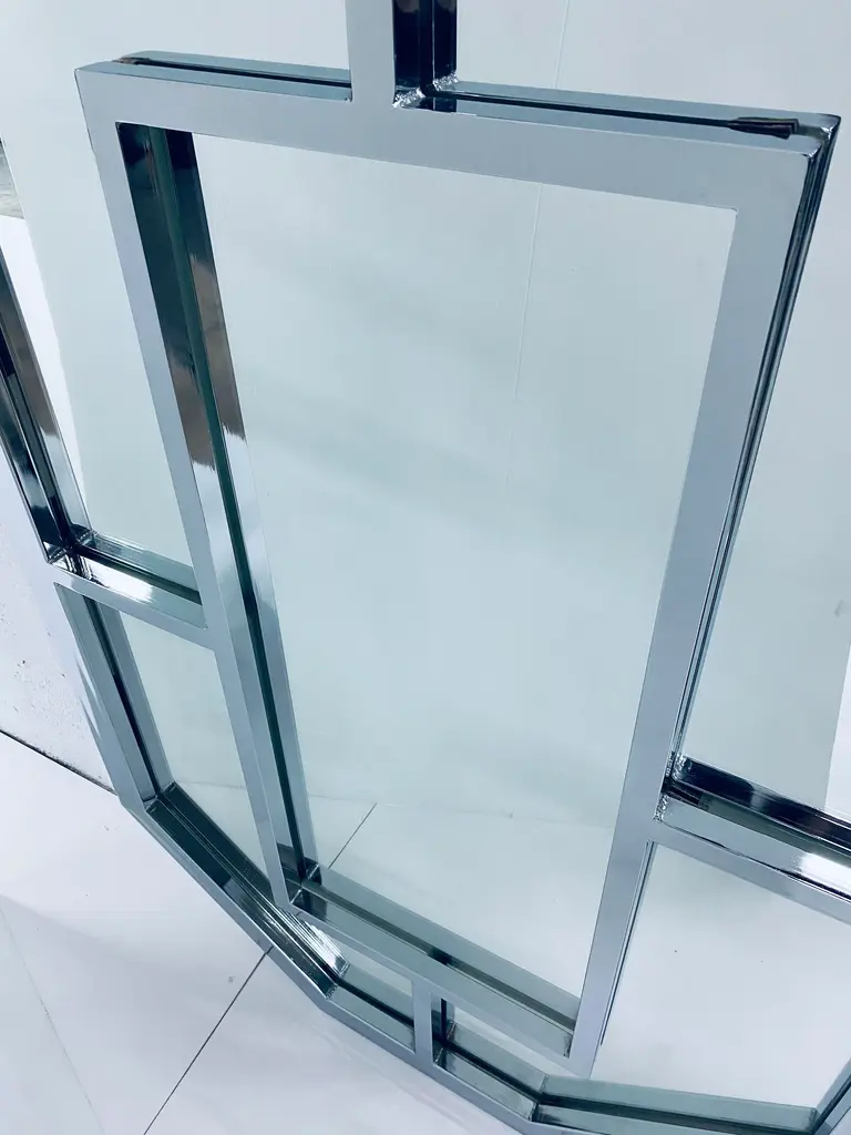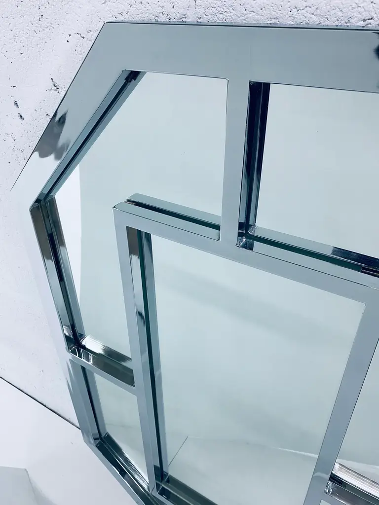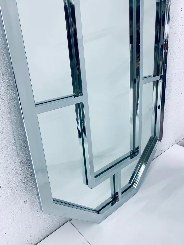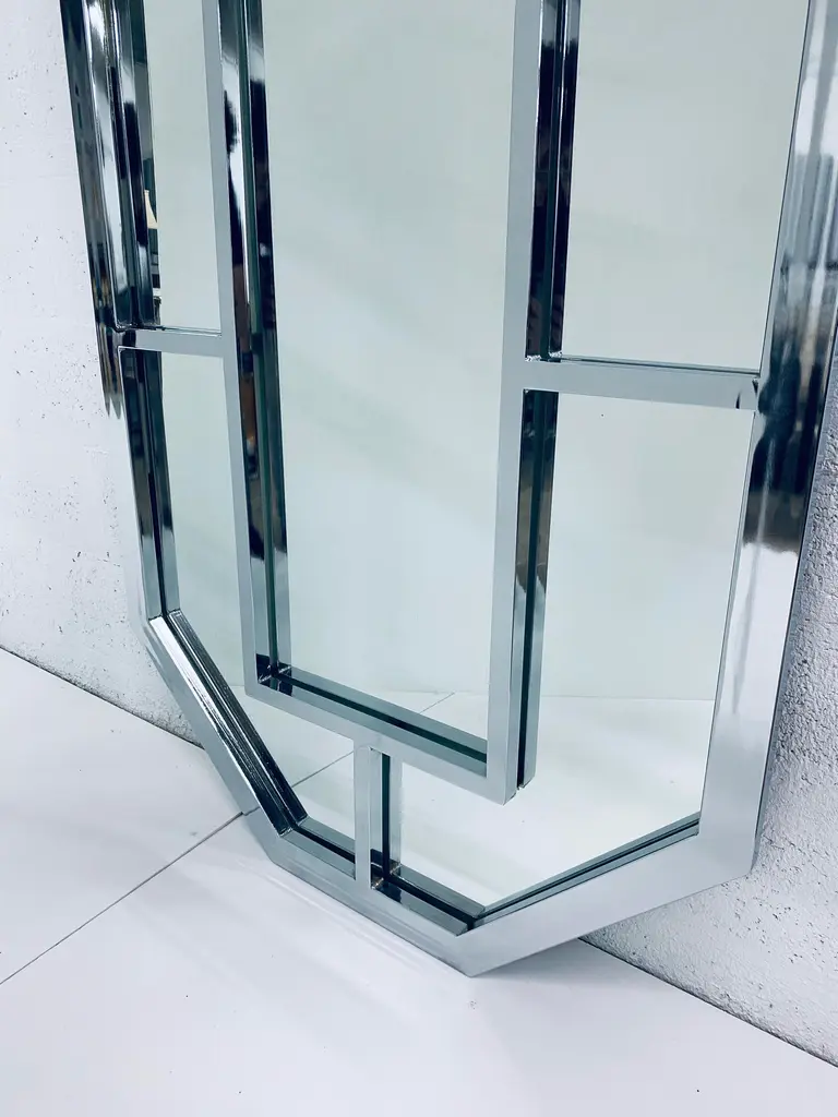 Mid-Century modern octagonal wall mirror with large polished chrome trellis frame by Milo Baughman for Thayer Coggin. Two available.