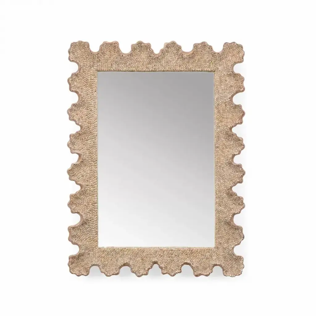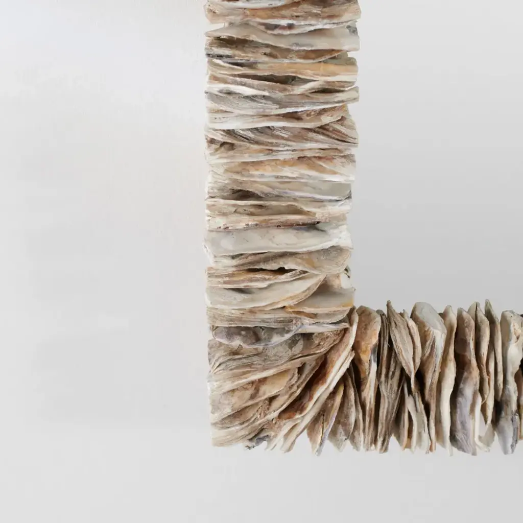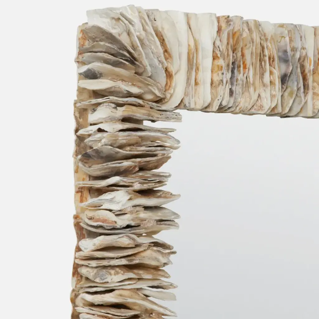The textural Mina is a perfect example of how Made Goods does beachy-rather than a sparse use of oyster shells, the frame of this coastal-inspired mirror stacks them up, highlighting their unique shape and hues. The raw materials create an almost sculptural feel, an inspired and modern take on the typical shell piece. The thick oyster shell frame has an approximate 3" or 4" depth. Now available in a new size!