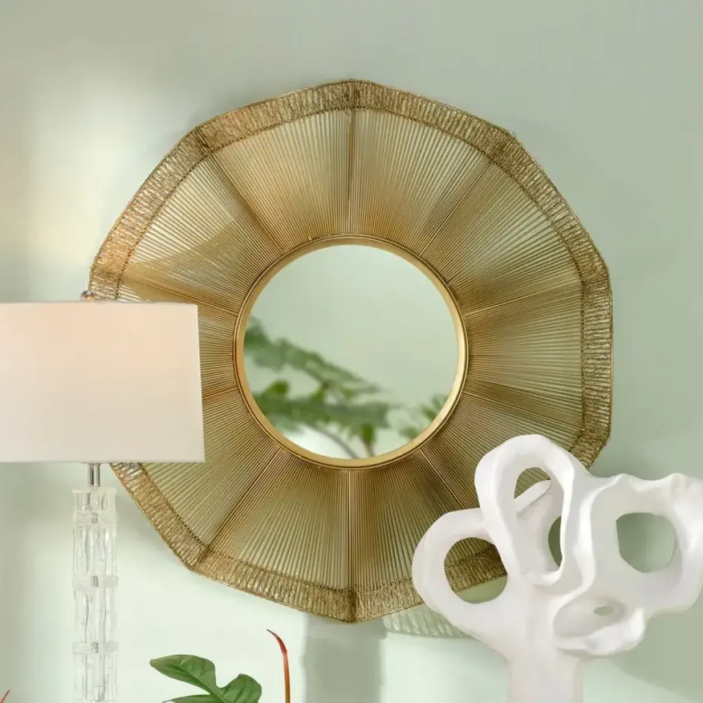 Minette radiates proudly from an understatedly bold center. The fan-like, wavy border is finished with intricate patterning at the edge and made to complement the smooth mirrored surface.