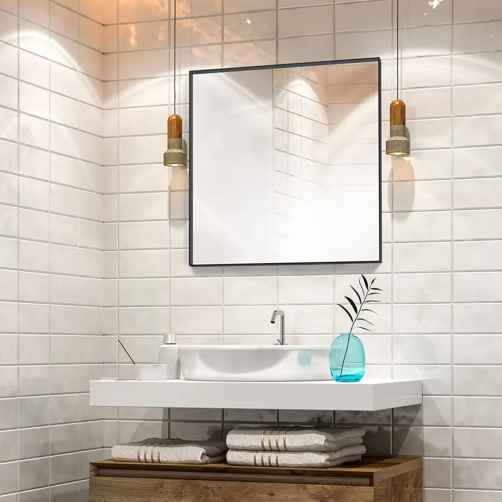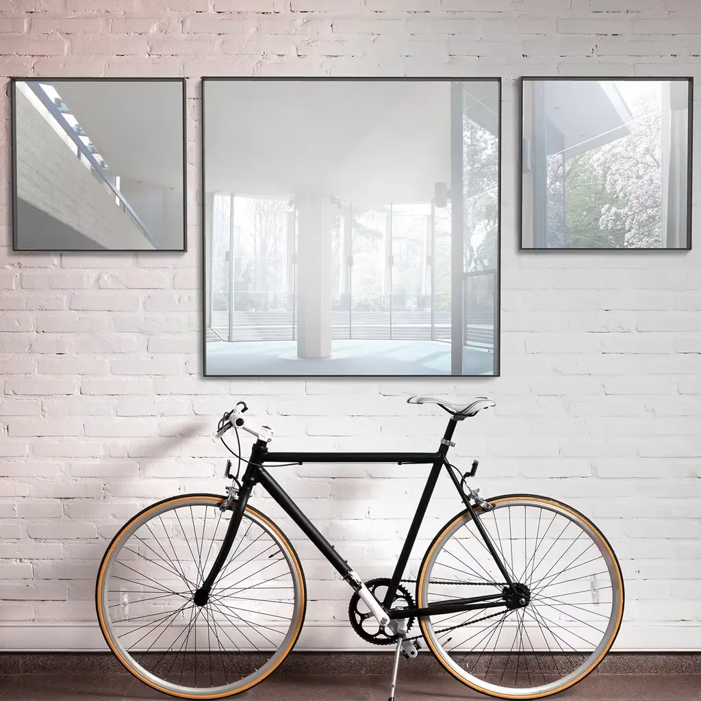 Mini is an elegant piece of furniture, that fits in different types of environment. A mirror with a refined design and a metal frame with black finish. It is possible to customize the mirror according to customers' need, available in different sizes and finishes. The version shown here is square with a height and width of 90 cm.