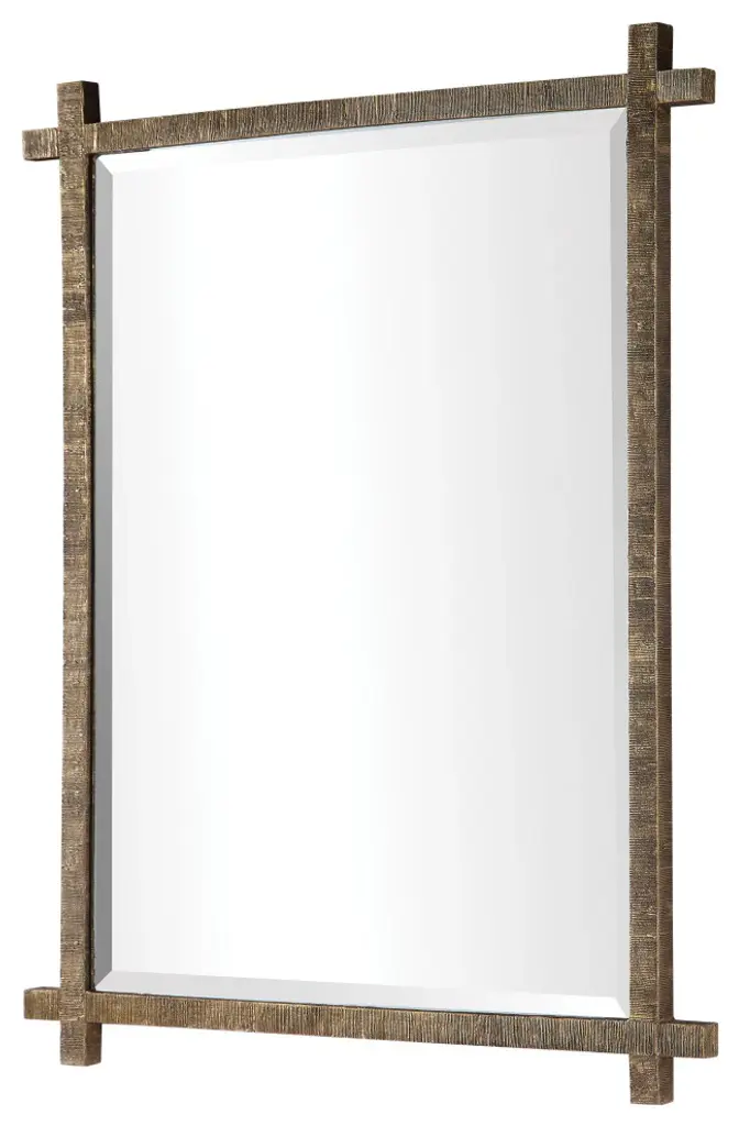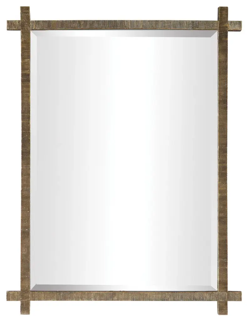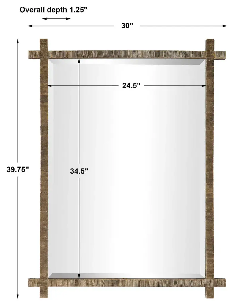 This Mirror Features An Antique Gold Finished Frame With Ribbed Texture, Adding A Tribal Feel. The Piece Has A Generous 1 1/4" Bevel.• 39.75"H x 30"L x 1.25" deep. Weighs 20 lbs. Glass is 34.5" x 24.5"• Hand Finished Resin Frame• Properly weighted hanging hardware attached. Can be hung vertically or horizontally.• Heirloom Quality - Expertly hand crafted and hand finished. Due to the hand crafted nature of this piece, each piece may have subtle differences.