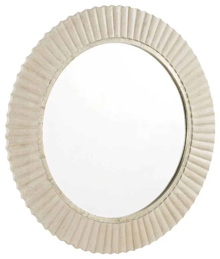 The Mirabelle Wall Mirror from Regina Andrew uses individually placed bone pieces to create precise, radiating lines in its frame design. The natural material brings depth through its pleated arrangement, while the circular shape draws inspiration from classical French design. Small grooves between each bone segment catch and reflect light in different directions throughout the day. The central mirror amplifies natural light in any room, making spaces feel more open and bright. This wall décor works particularly well as a statement piece above fireplaces or in entry halls.