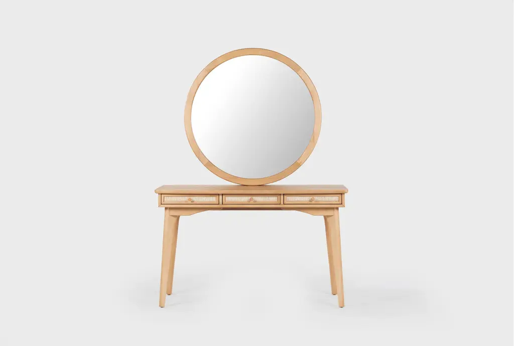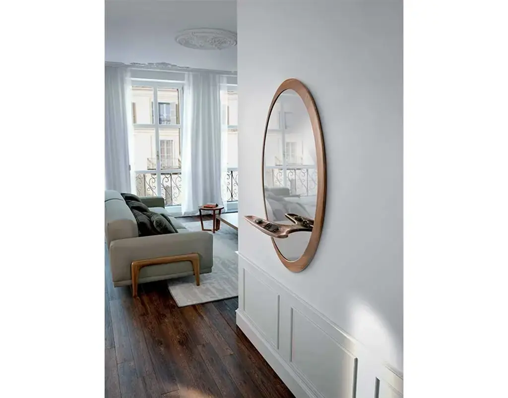 MIRAGE is a round mirror with a solid Canaletto walnut frame.Mirage serves as an entryway mirror made of solid wood and is also available in a round version with a catch-all shelf. It comes in natural or bronzed finishes and features three geometric models with rounded shapes.Ideal for tastefully furnishing your home’s entrance, the warmth of the wood adds a welcoming touch. This accessory is perfect for a final glance before heading out.The optional shelf is mounted directly on the mirror and has an asymmetrical, shaped design with rounded edges and a slight recess, ideal for holding house keys.