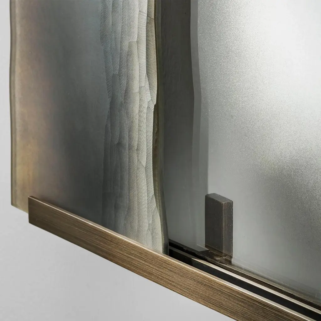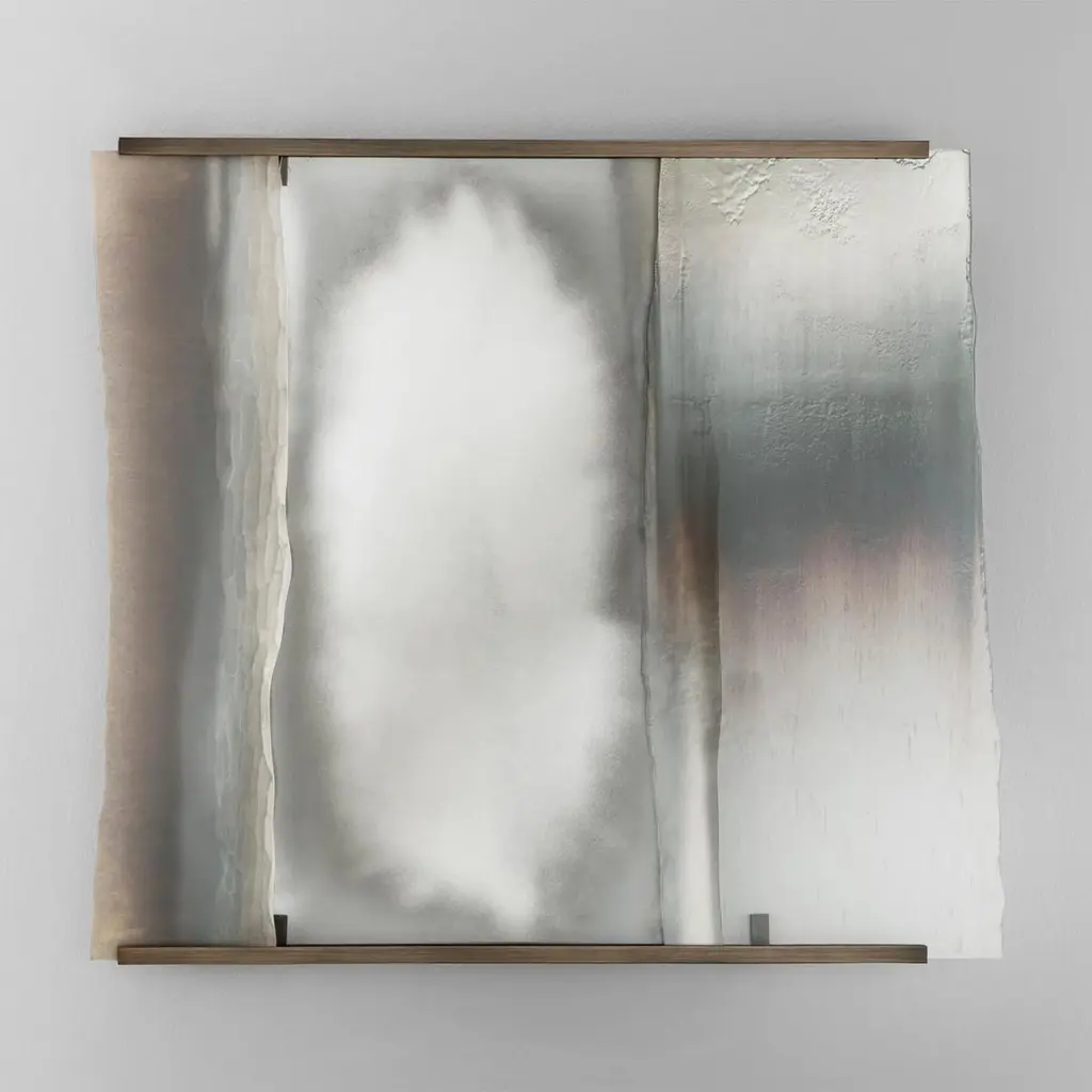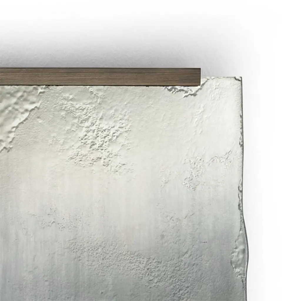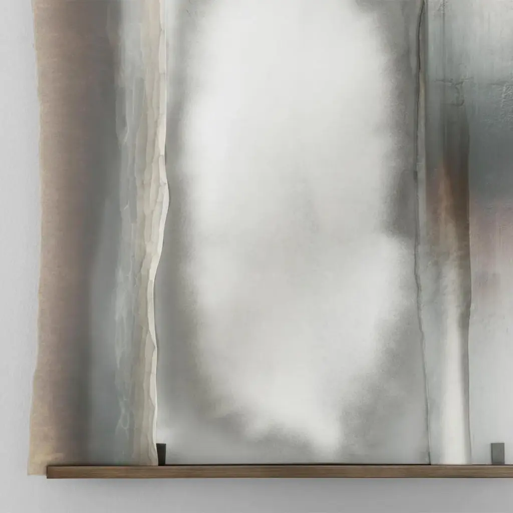 Mirror Mirage II with 3 glass panels. 1 back baked glass panel with central part in mirror glass in medium antique finish around. With 2 sliding panels in baked glass, each in 2 different arty finish. Mirror with 2 profiles in brass in brushed and burnished finish.Also available on request in Mirror Mirage I.
