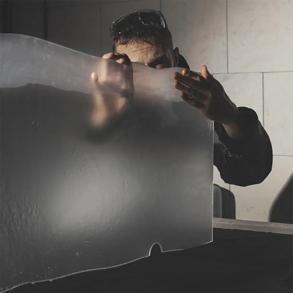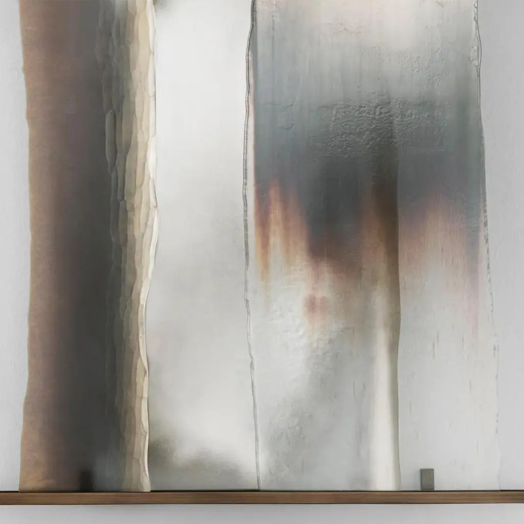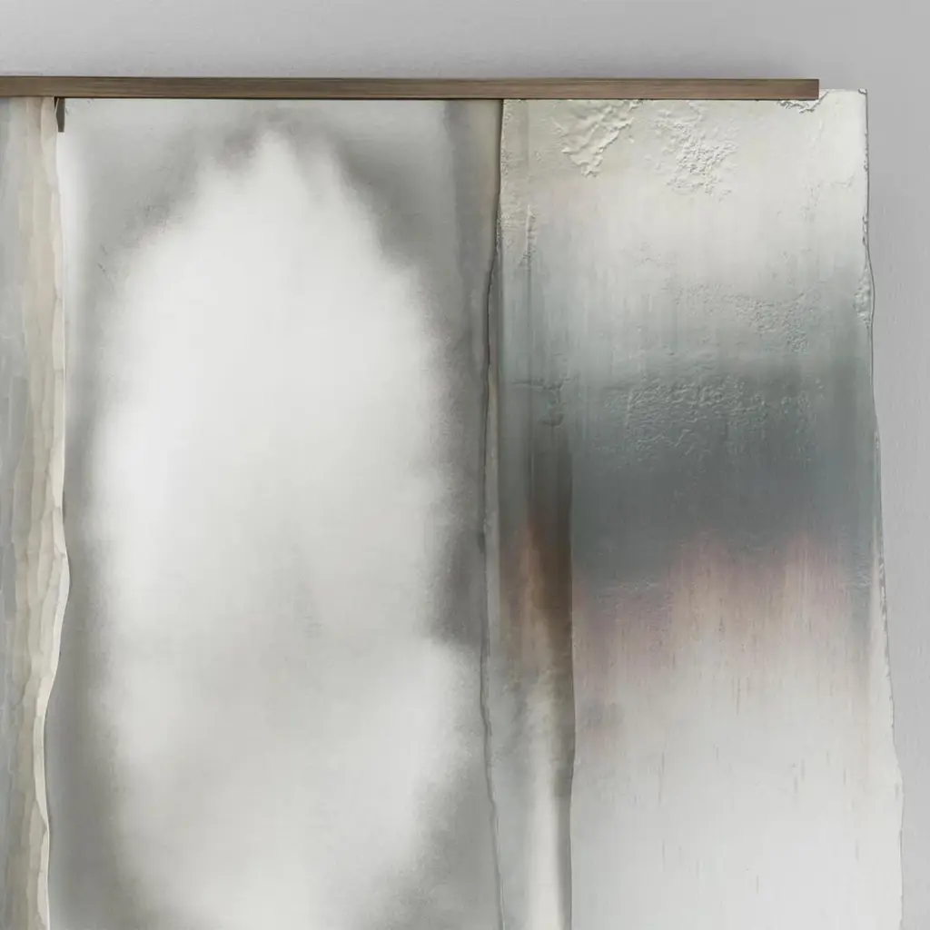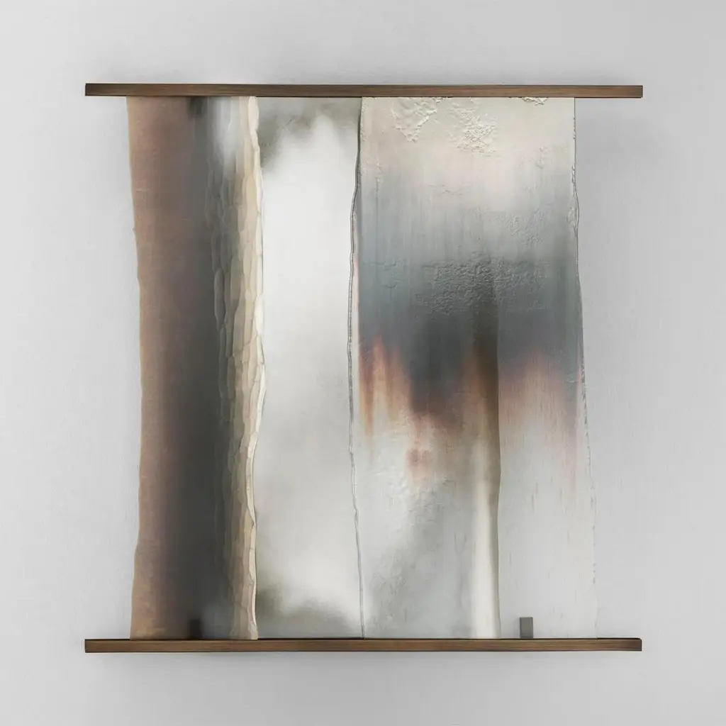 Mirror Mirage II with 3 glass panels. 1 back baked glass panel with central part in mirror glass in medium antique finish around. With 2 sliding panels in baked glass, each in 2 different arty finish. Mirror with 2 profiles in brass in brushed and burnished finish.Also available on request in Mirror Mirage I.