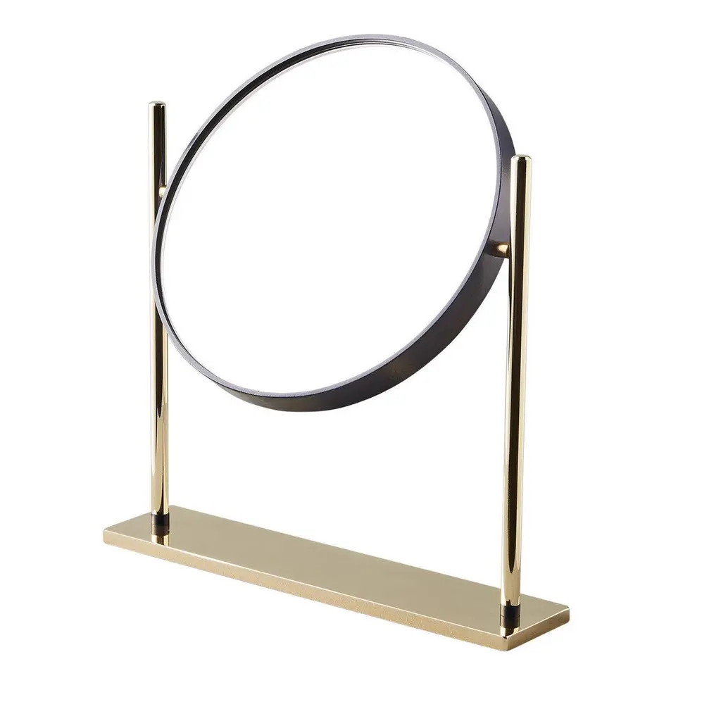 This piece was designed by Federica Biasi and is ideal as mirror in a small study or bathroom mirror. Its precious silhouette displays perfectly proportioned lines that mix the straight elements of the base with the round frame of the mirror with its blue-green shades. Entirely made in brass, this piece will add a touch of elegance and contemporary design to any decor.