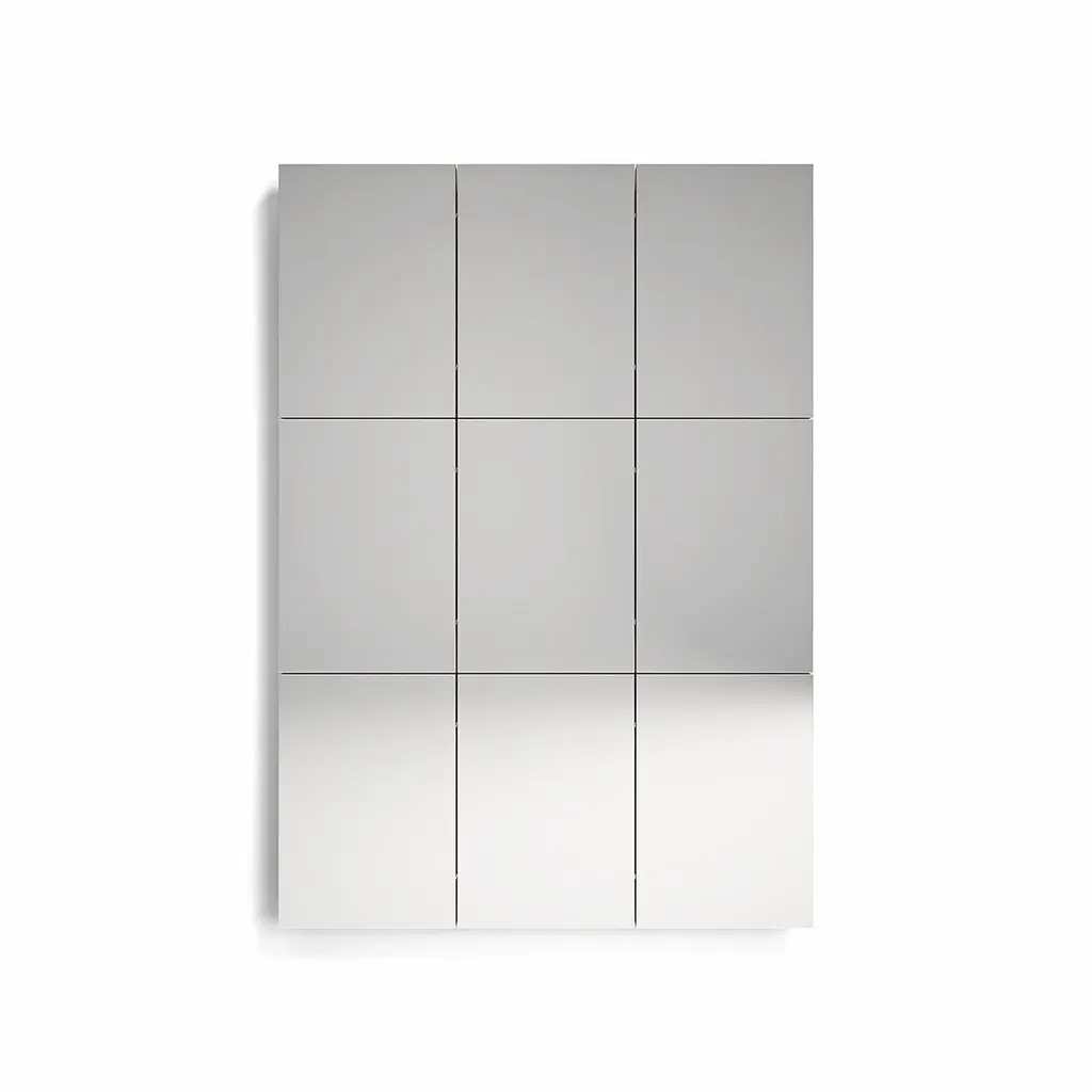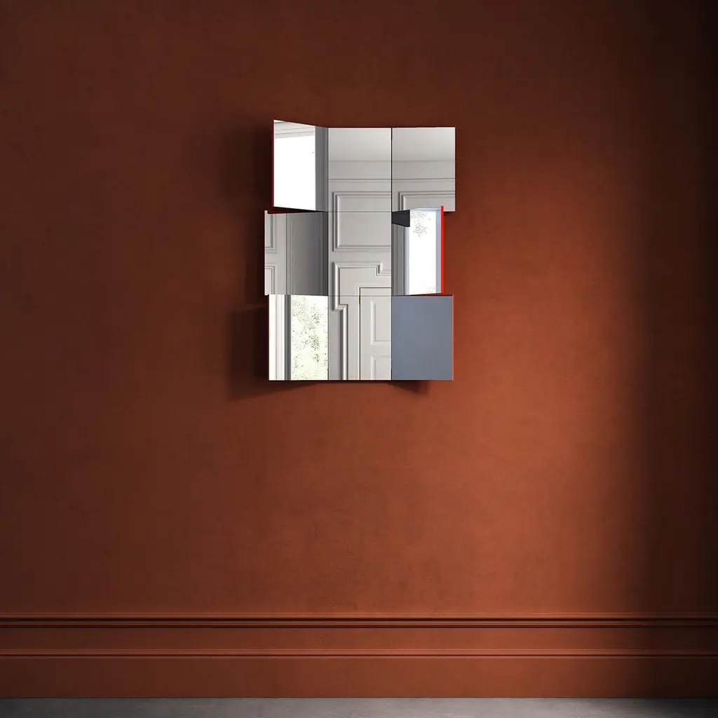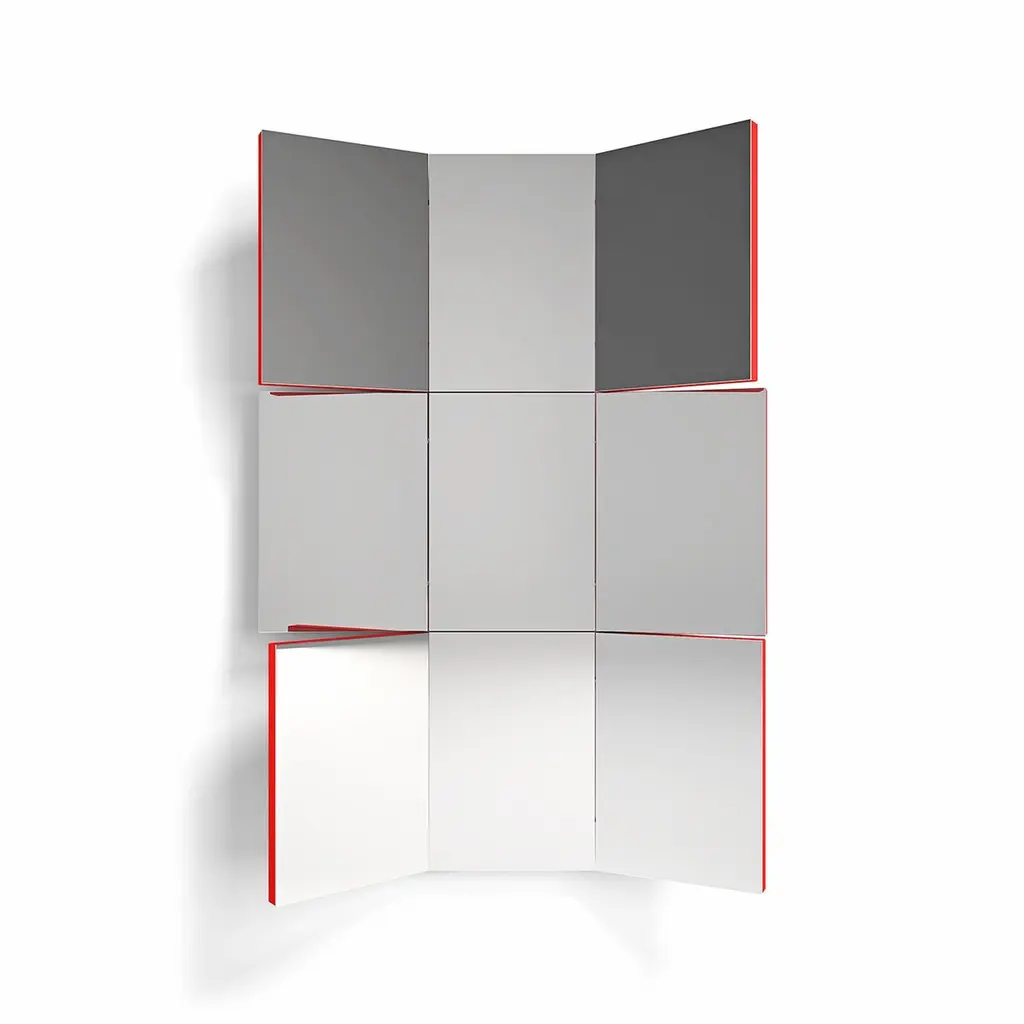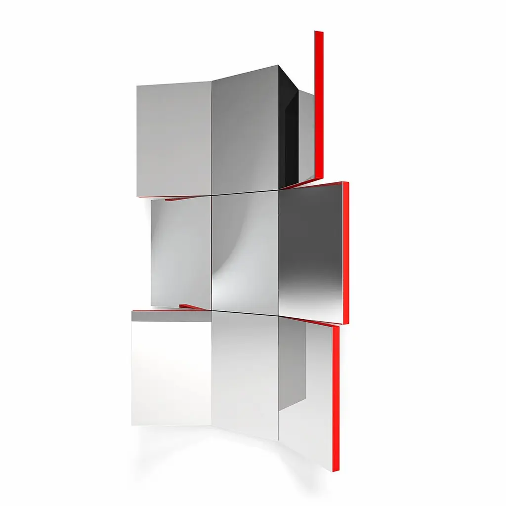 This leading-edge mirror flaunts a smart aesthetic that elevates it to a contemporary artwork. The red-lacquered wooden structure is linked to the nine rotating panels crafted of stainless steel and made perfectly reflective thanks to a uniform, non-directional polishing process that achieves the so called SuperMirror finish. Two brackets for an easy wall mounting are anchored on the back of the mirror.
