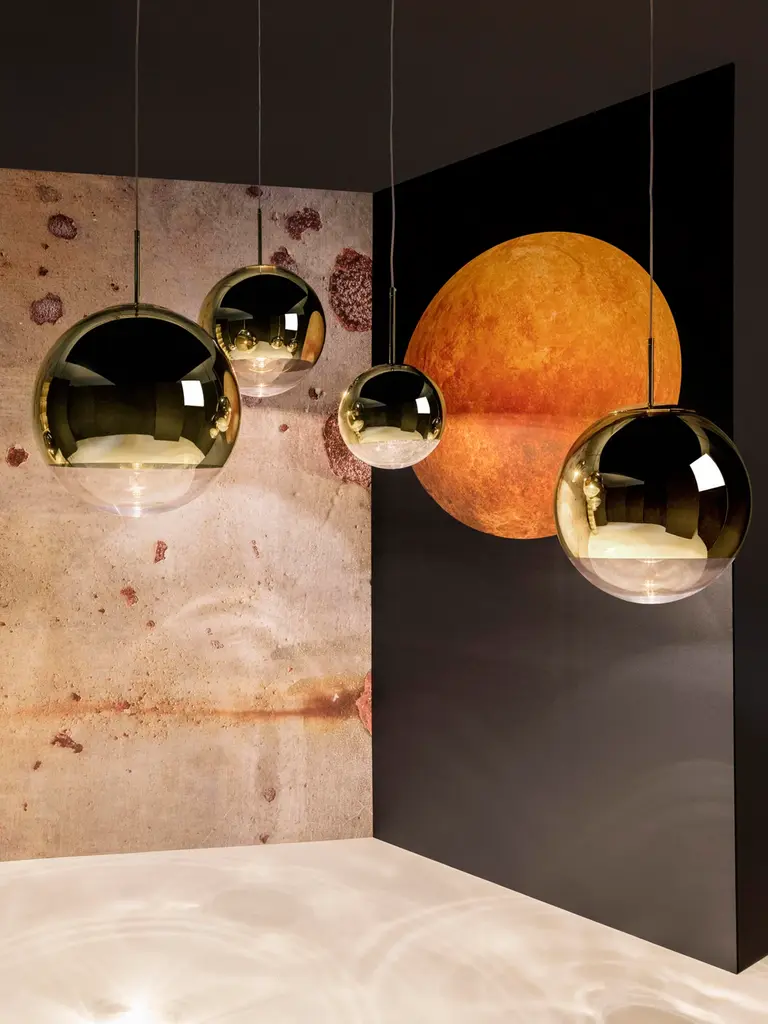 The Mirror Ball, inspired by space helmets and disco balls, is lightweight and robust, reflecting its environment and projecting ambient light downward. It stands out as a highly reflective piece, adding depth and character to any given space. Great solo or with other Mirror Balls.