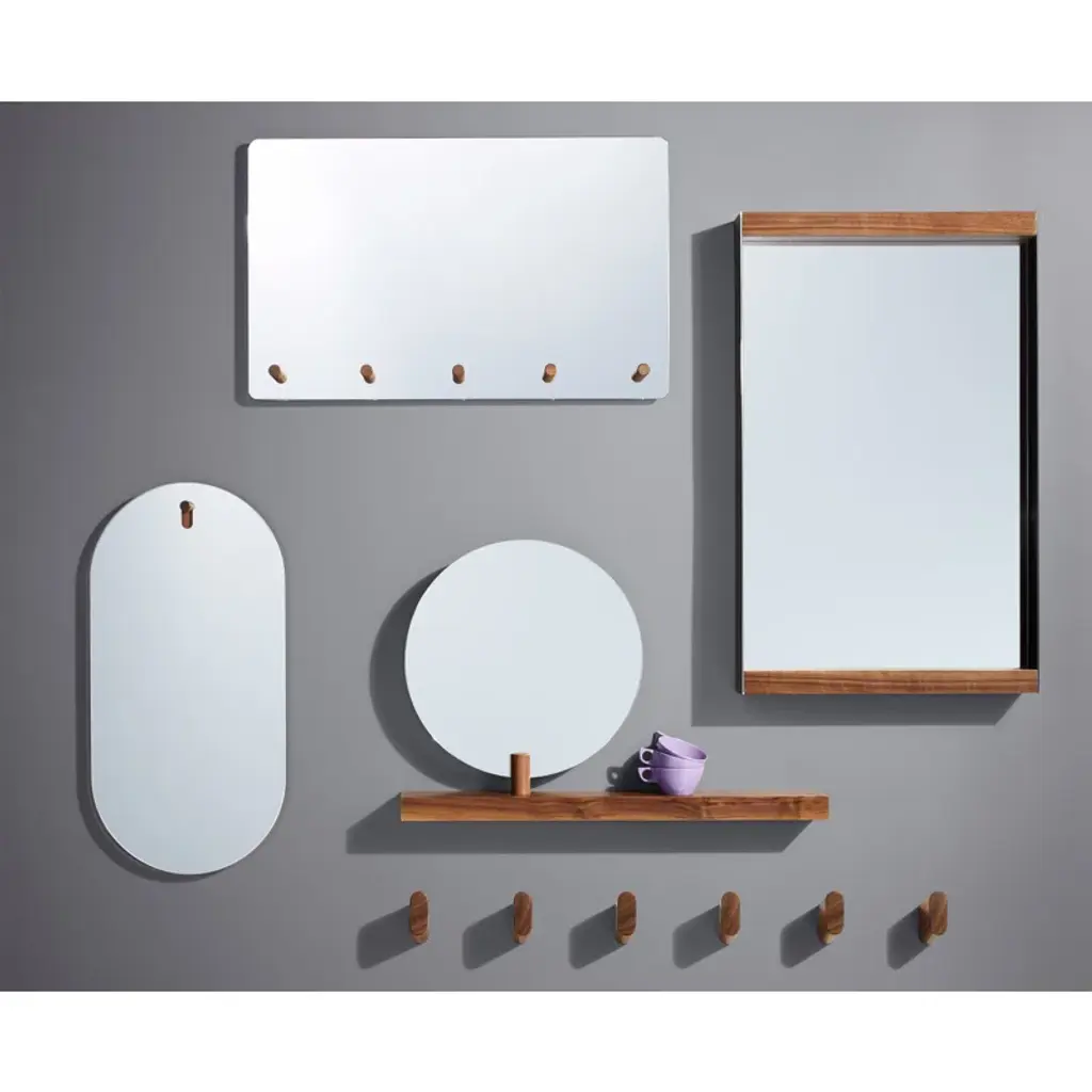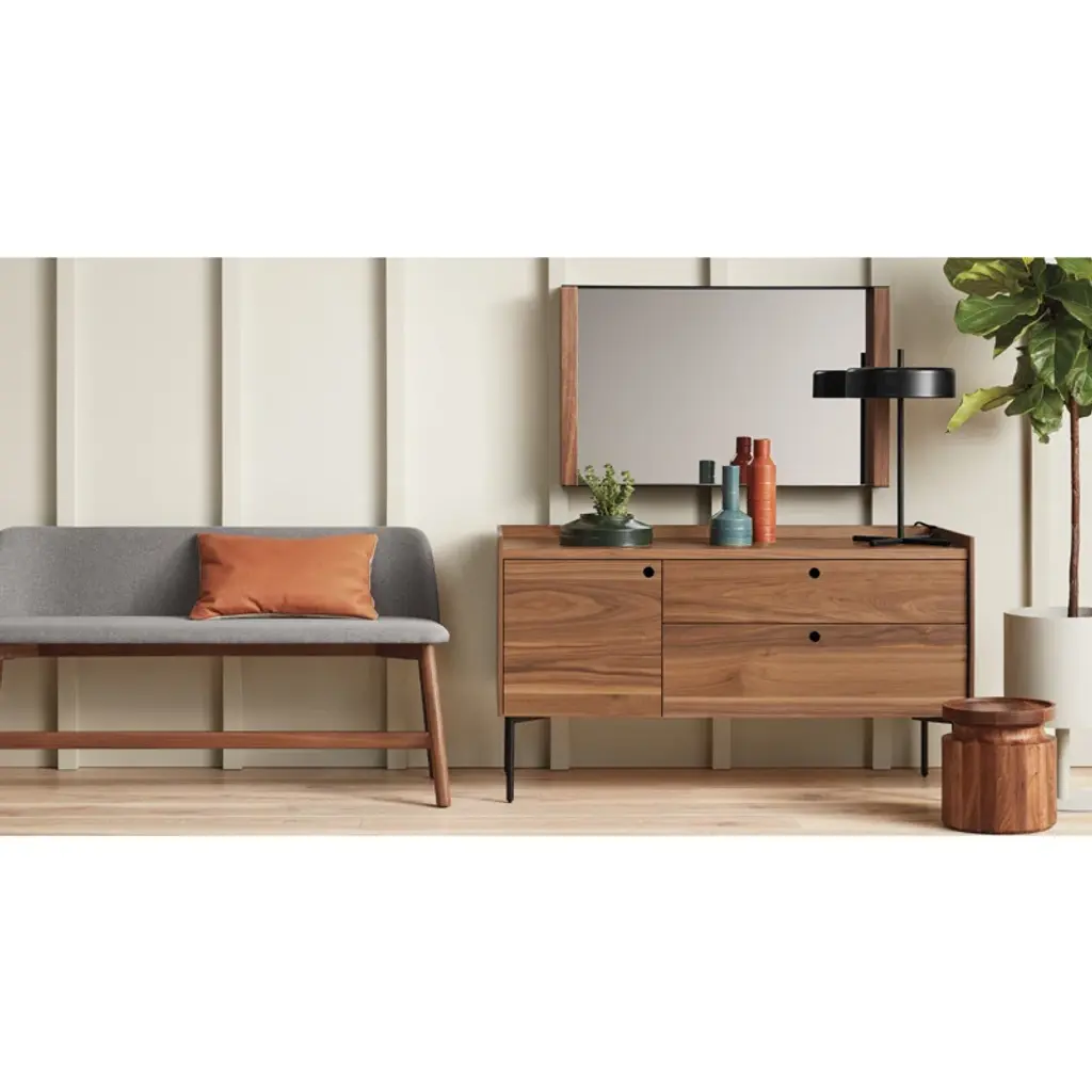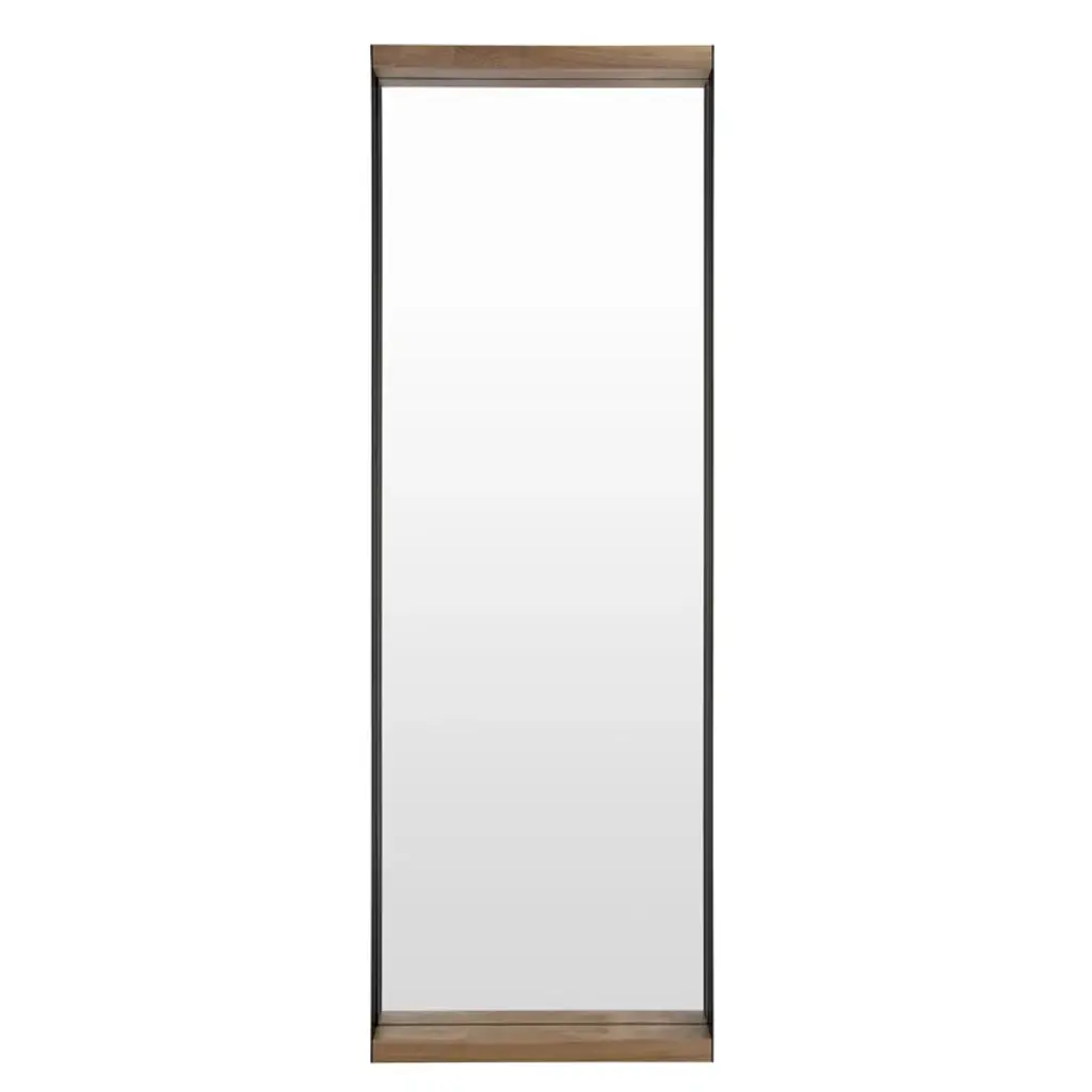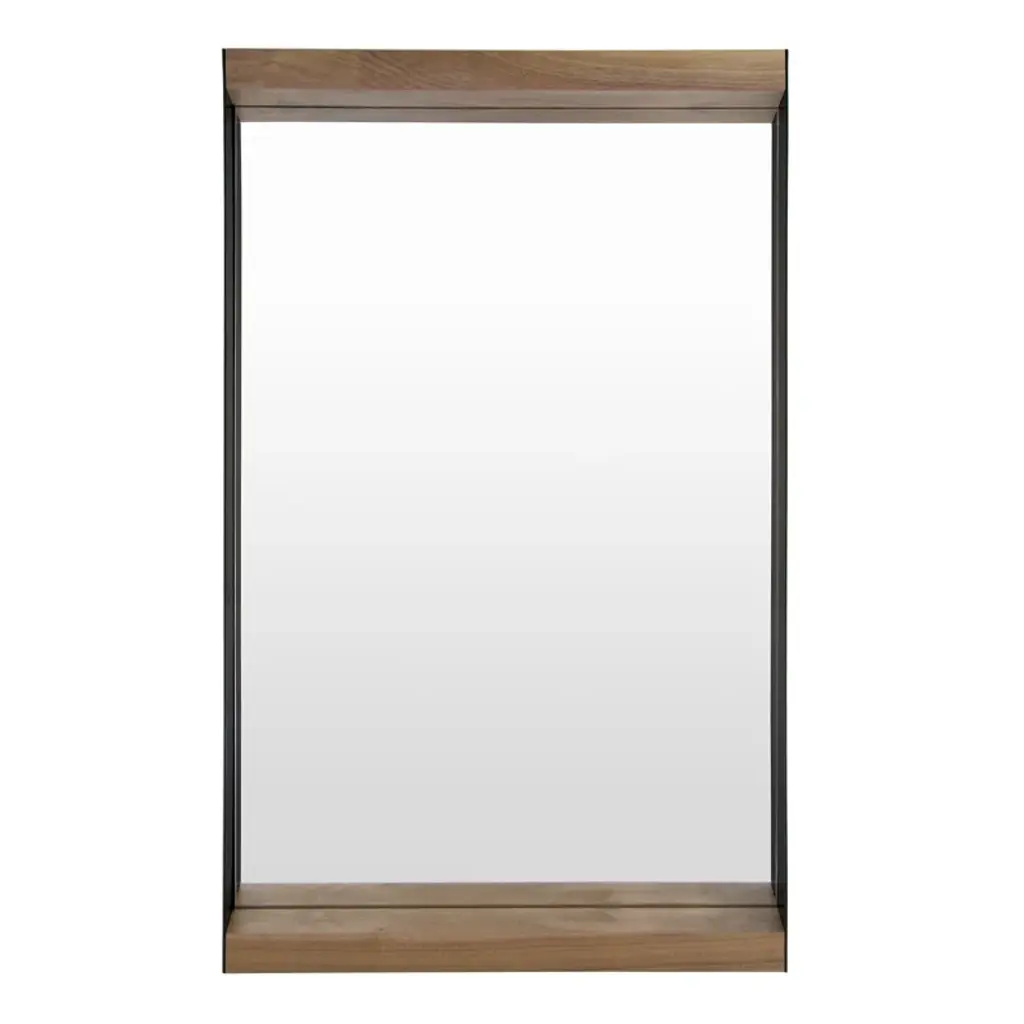 Wicked witches never had it so good. Wood pairs solidly with an aluminum framed mirror for a subtle, yet striking effect.