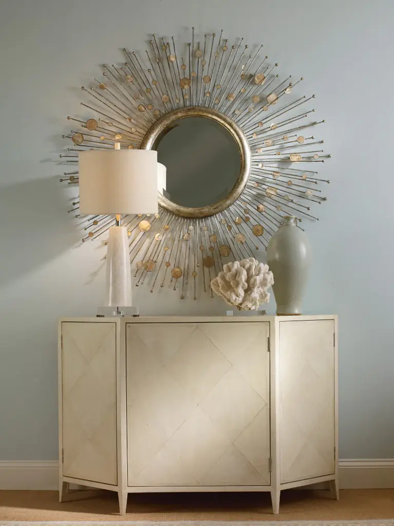 Silver antique finish on hardwood solids and wrought iron with inlaid capiz shell trimBeveled mirrorDesigned by Pride Sasser