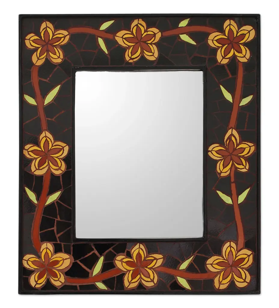 Flowers from the cassia fistula, or golden shower tree, flourish in a colorful mosaic by Lalit Sakhuja. Handcrafted of ceramic tiles, it surrounds an original wall mirror. A copper wire at the back facilitates wall display.