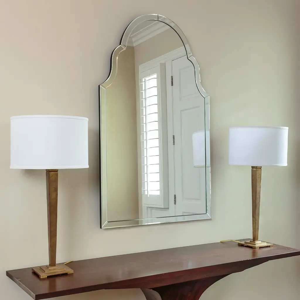 Dimensions: 32" x 52" Materials: Iron, Wood and Mirror Finish: Antique Gold Leaf, Antique Silver leaf, or Mirror Framed Mirror Details: Non-beveled. Weight: 33 lbs. Shipping: FedEx ground Cleat & hanging hardware included Free shipping in the U.S.