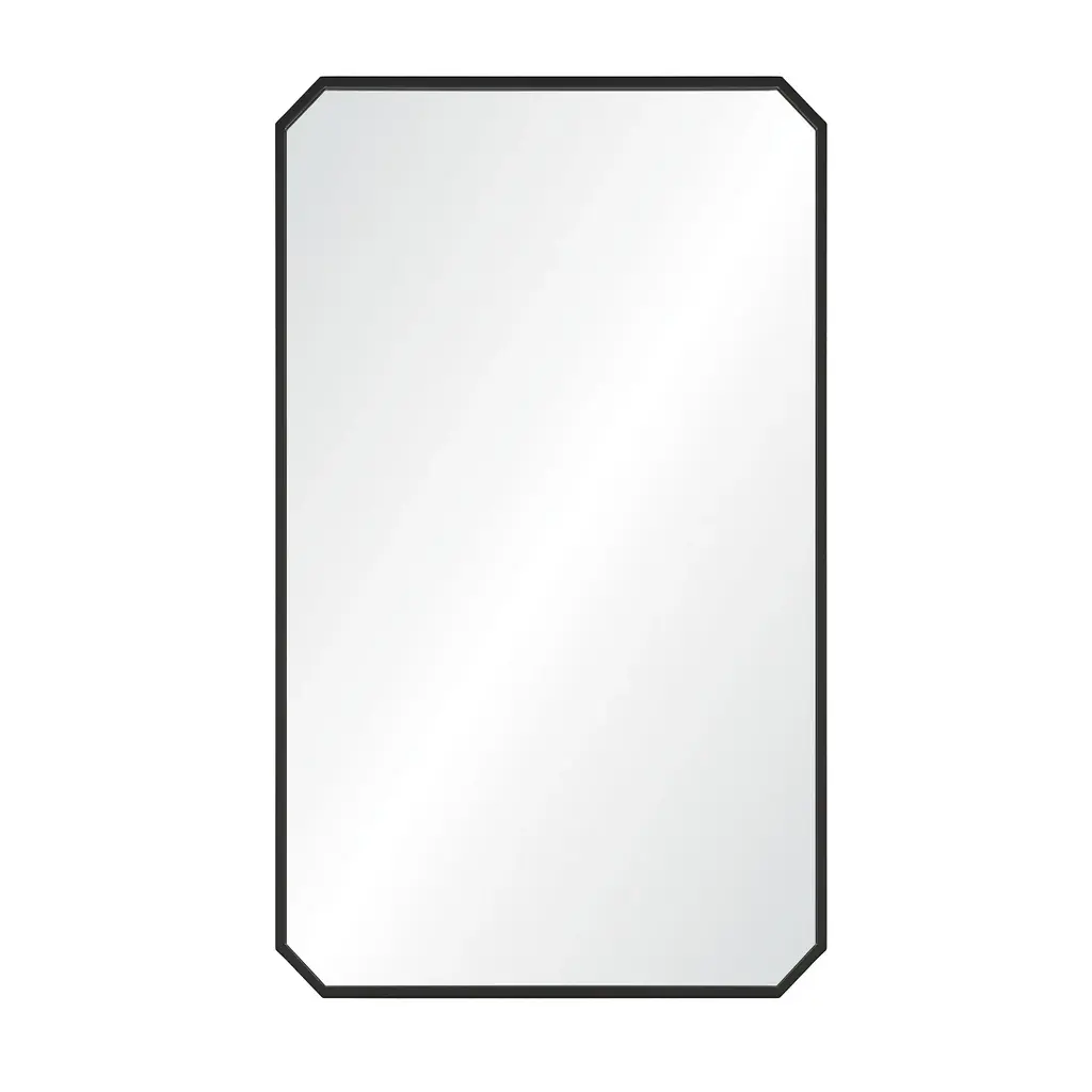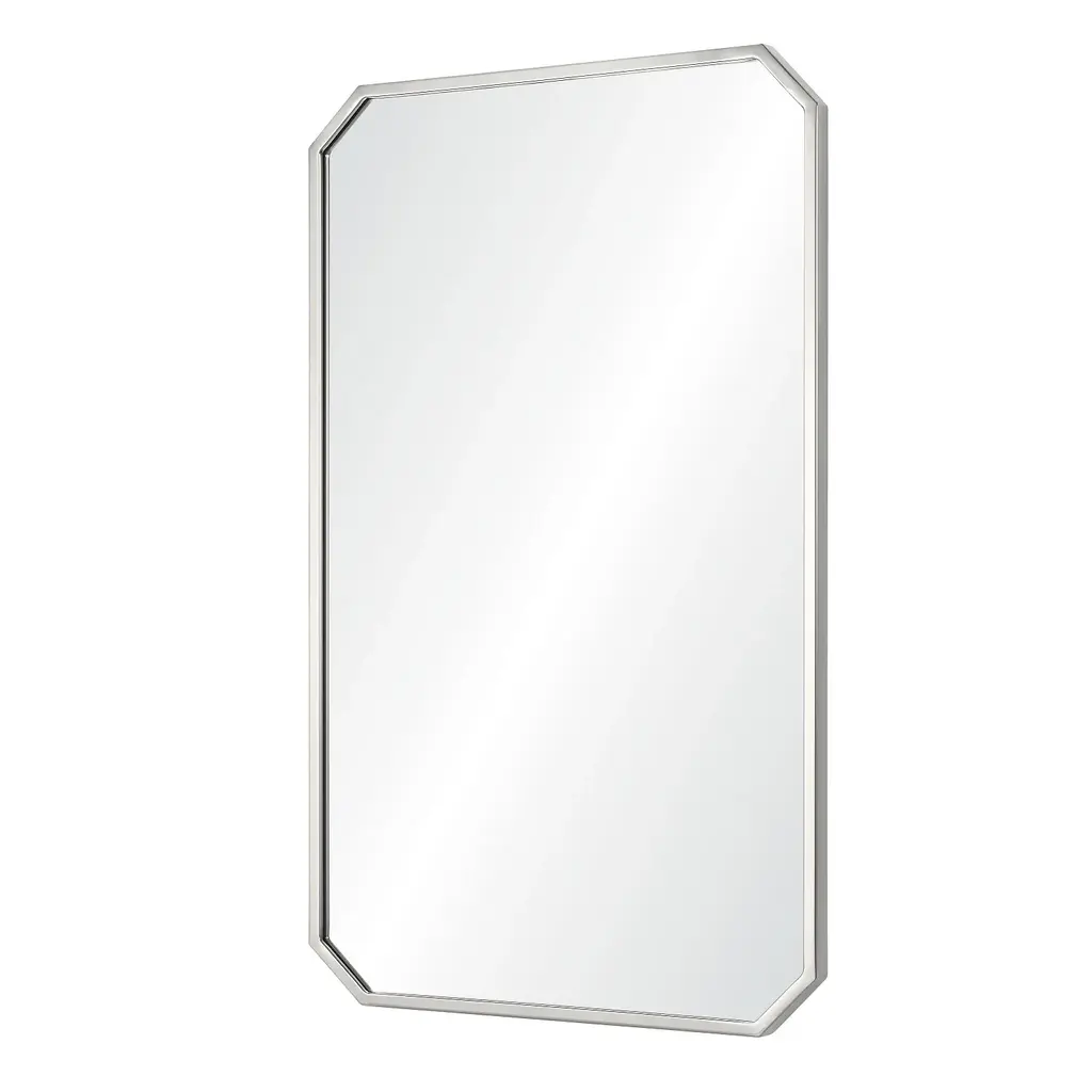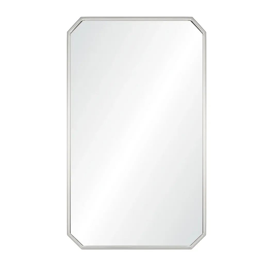 Hand welded stainless steel mirror finished in black nickel, burnished brass or polished stainless steel. Non-beveled center mirror. Cleat hardware provided. Item can hang horizontally or vertically.