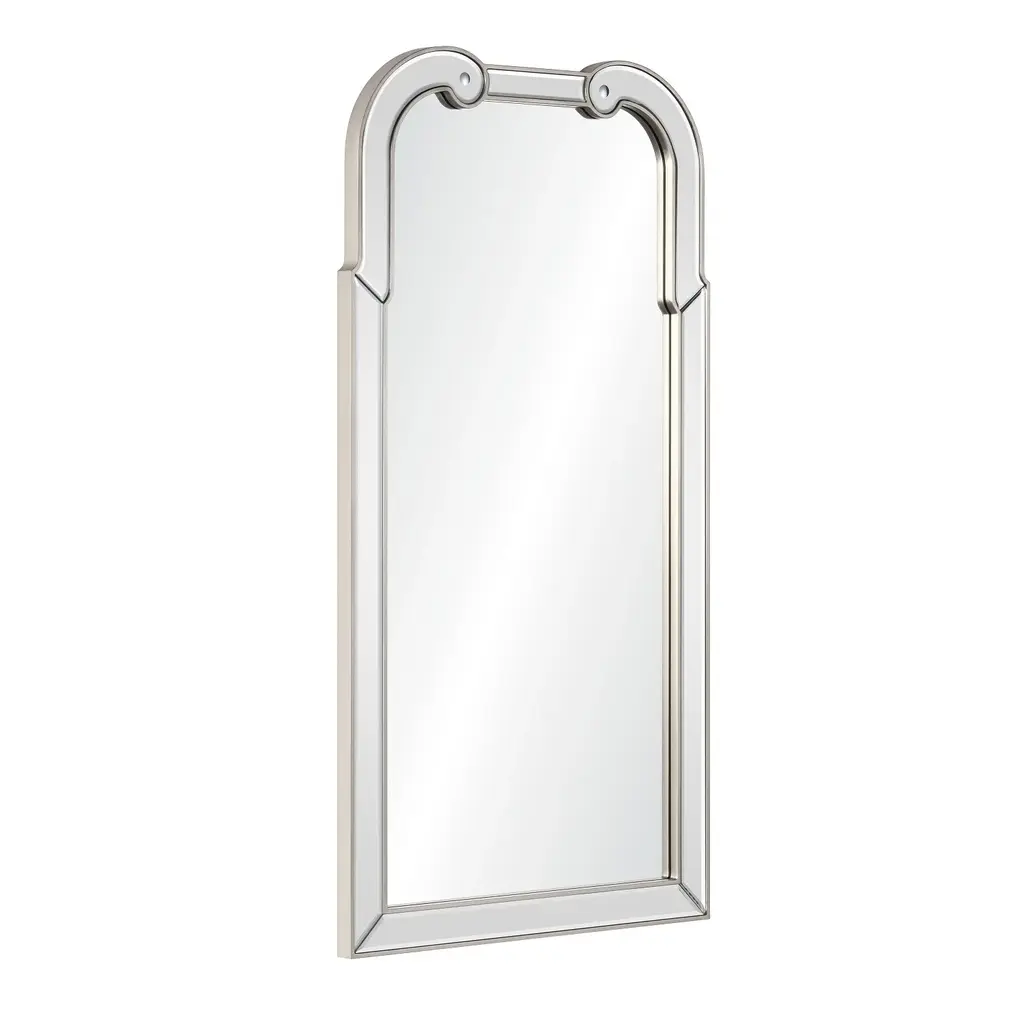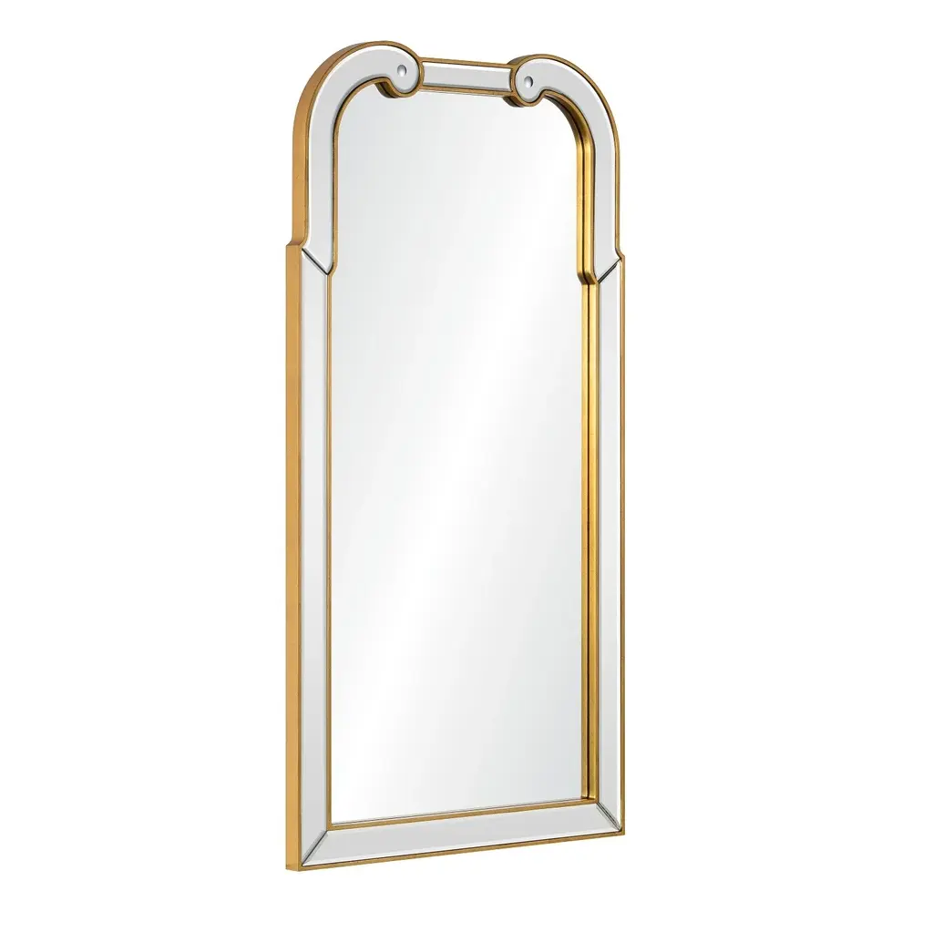 This Mirror Home Hadsepn mirror features a hand carved queen Anne shaped mirror finished in distressed gold leaf or silver leaf. This mirror offers an ultra sophisticated and modern take on the classic Queen Anne style. Non-beveled center mirror is surrounded by hand cut and beveled mirrors. Dimensions: 26" x 50" Materials: Wood and Mirror. Finish: Gold Leaf or Silver Leaf Detail: Non-Beveled. Weight: 32lbs. Shipping: Ground, Boxed. Cleat & hanging hardware included Ships via Fed Ex Free shipping in the U.S.