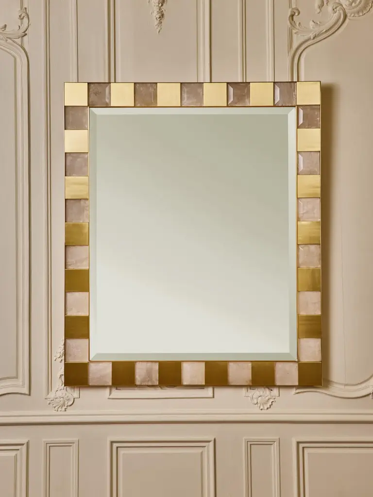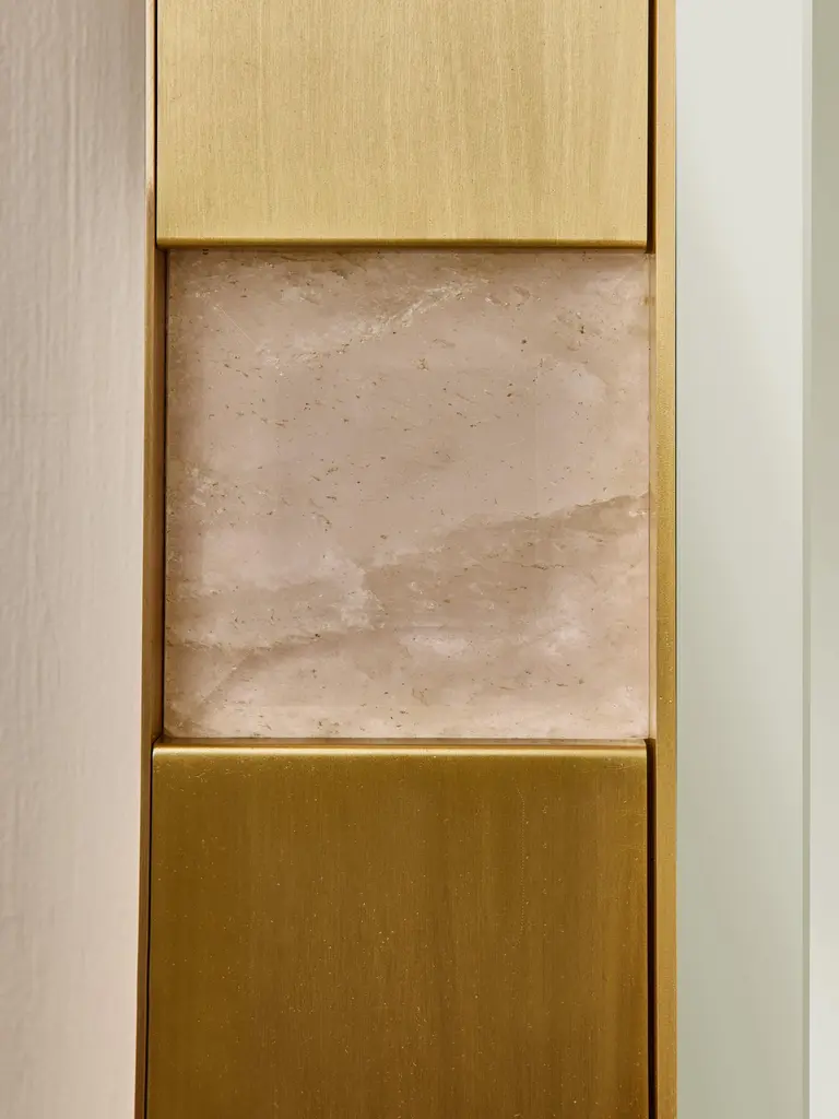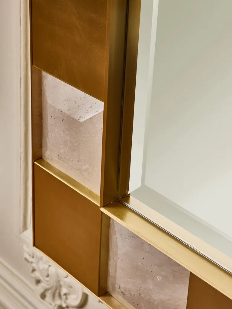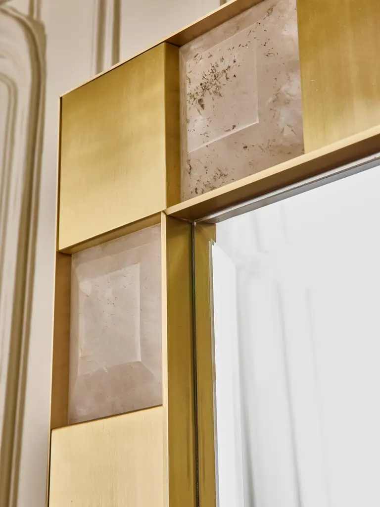 Mirror with frame in brass and beveled rock crystals. Creation by Studio Glustin.