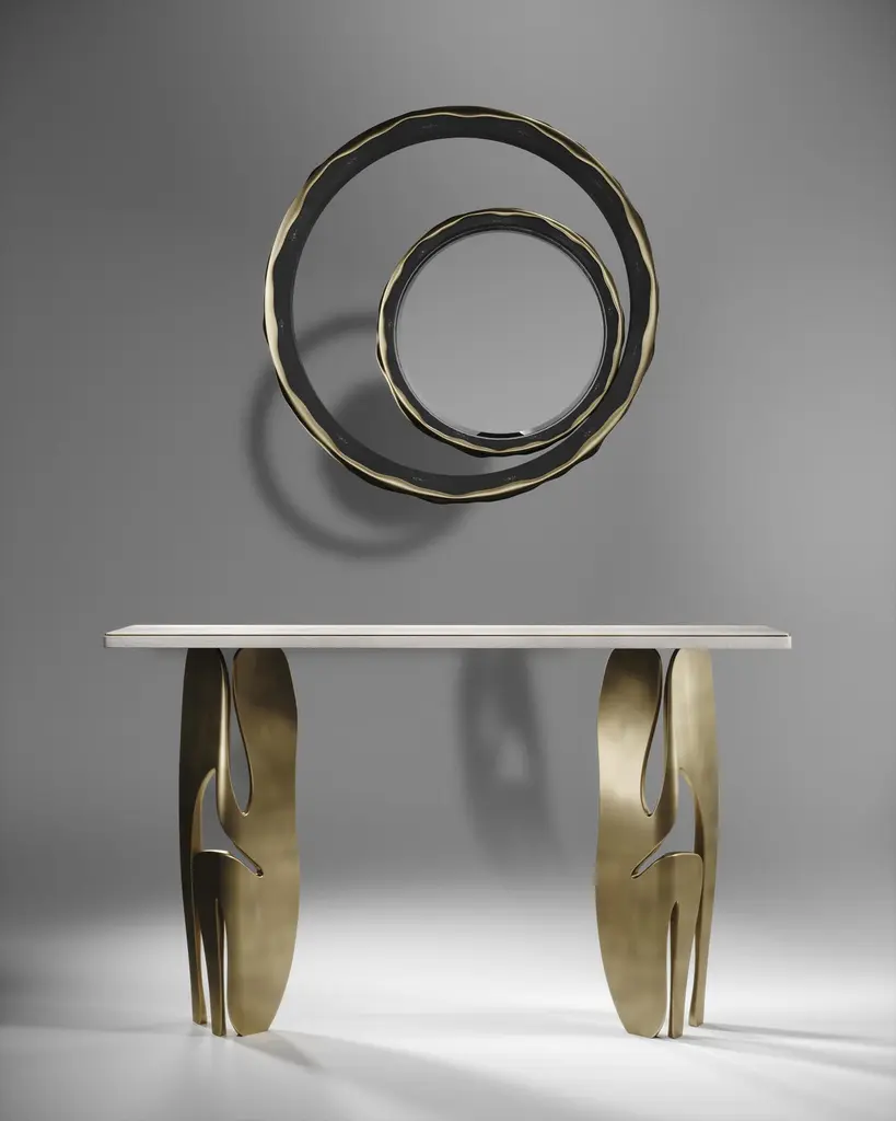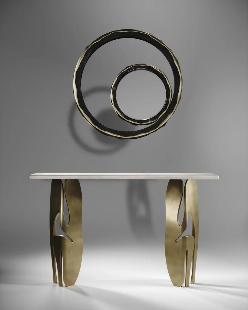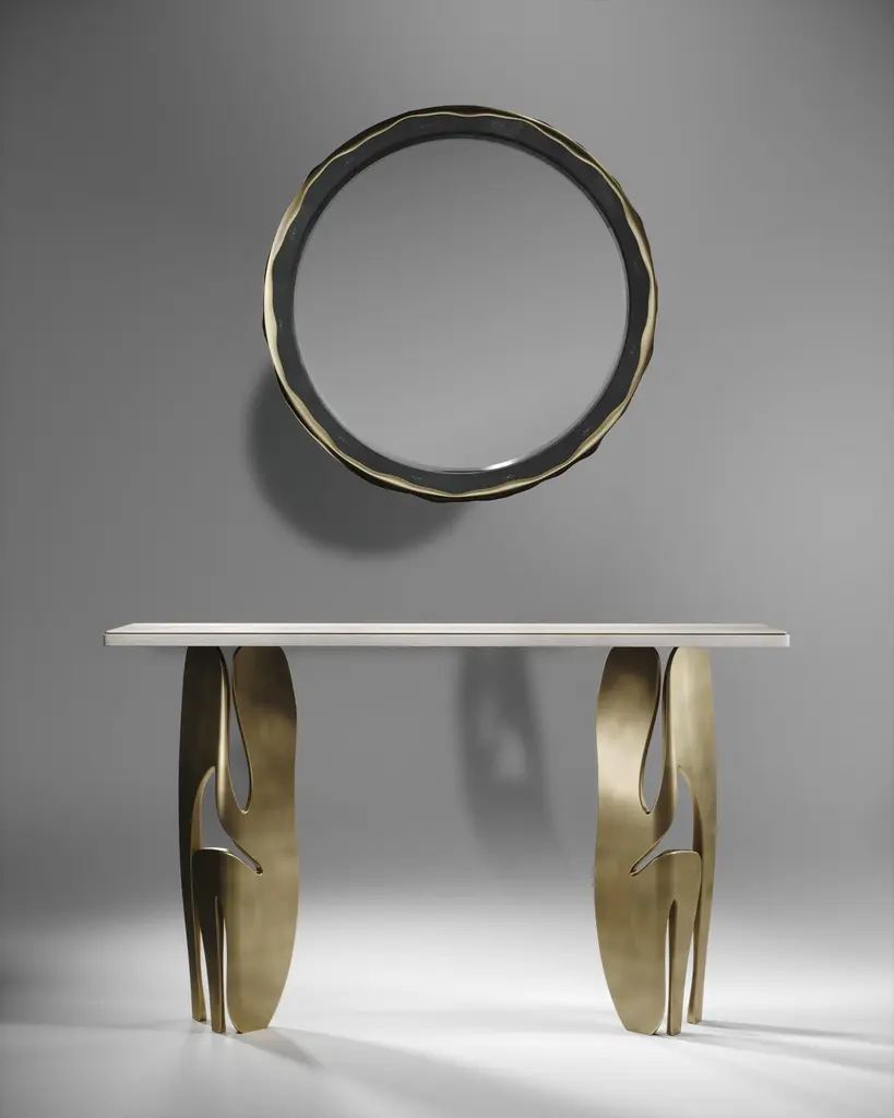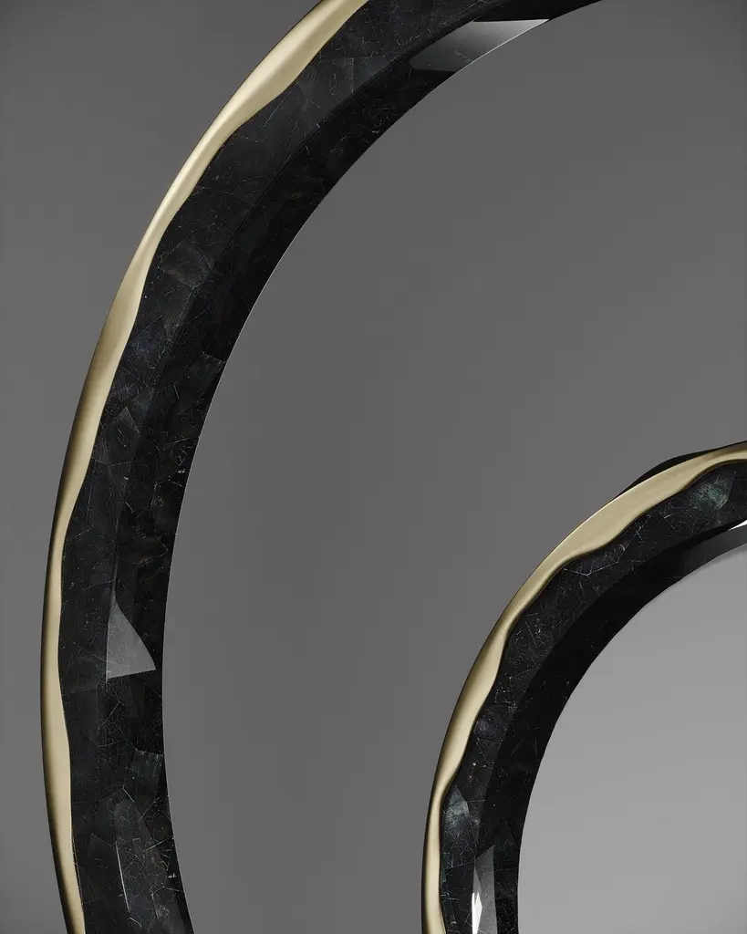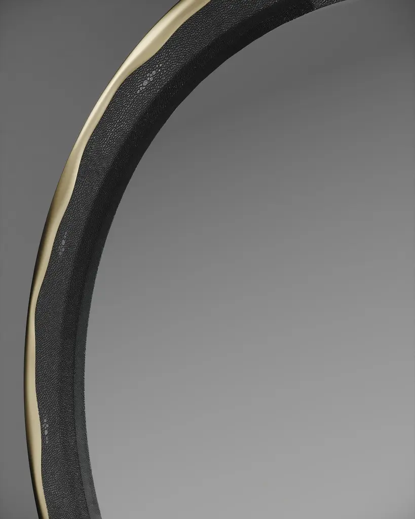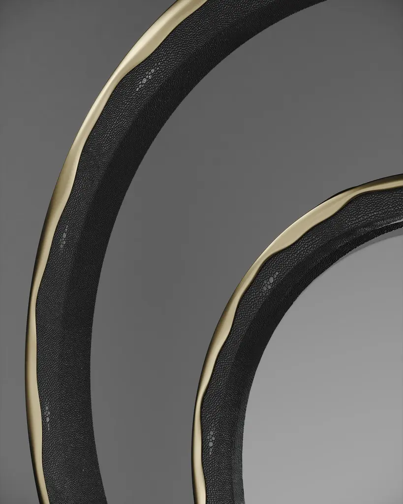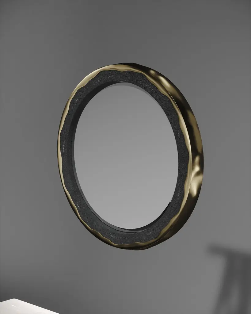 The Paris based label has distinguished themselves since their launch, with their iconic use of shagreen mixed with brass and other exotic materials. All furniture is handcrafted by skilled artisans, ultimately making each piece unique, designed in Paris and produced in the Philippines.The melting cut out mirror by R&Y Augousti inlaid in black pen shell and bronze-patina brass, is an iconic piece of theirs with their signature "melting" metal detail. Available in other finishes and "non cut-out" versions, see images at end of slide. Custom color and sizing available on request.All shagreen/shell is hand-dyed by our artisans. The dimensions of this piece are 90 diameter cm x 4 cm All R&Y Augousti pieces are handmade by artisans, ultimately making each piece unique. Wipe clean with soft dry cloth.Acclaimed design duo Ria & Yiouri Augousti have established themselves since the 1990s as pioneers of modern-vintage style through their luxurious Art Deco inspired collections.The Paris based label has distinguished themselves since their launch, with their iconic use of shagreen mixed with brass and other exotic materials. All furniture is handcrafted by skilled artisans, ultimately making each piece unique. All shagreen-covered items should be kept out of direct sunlight, color variants may occur on the stingray and other exotic finishes, but this showcases the Parisian label's commitment to creating authentic luxurious products using natural components.