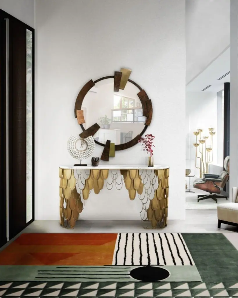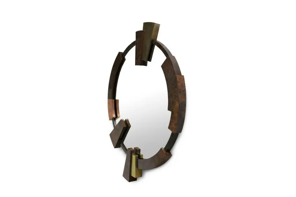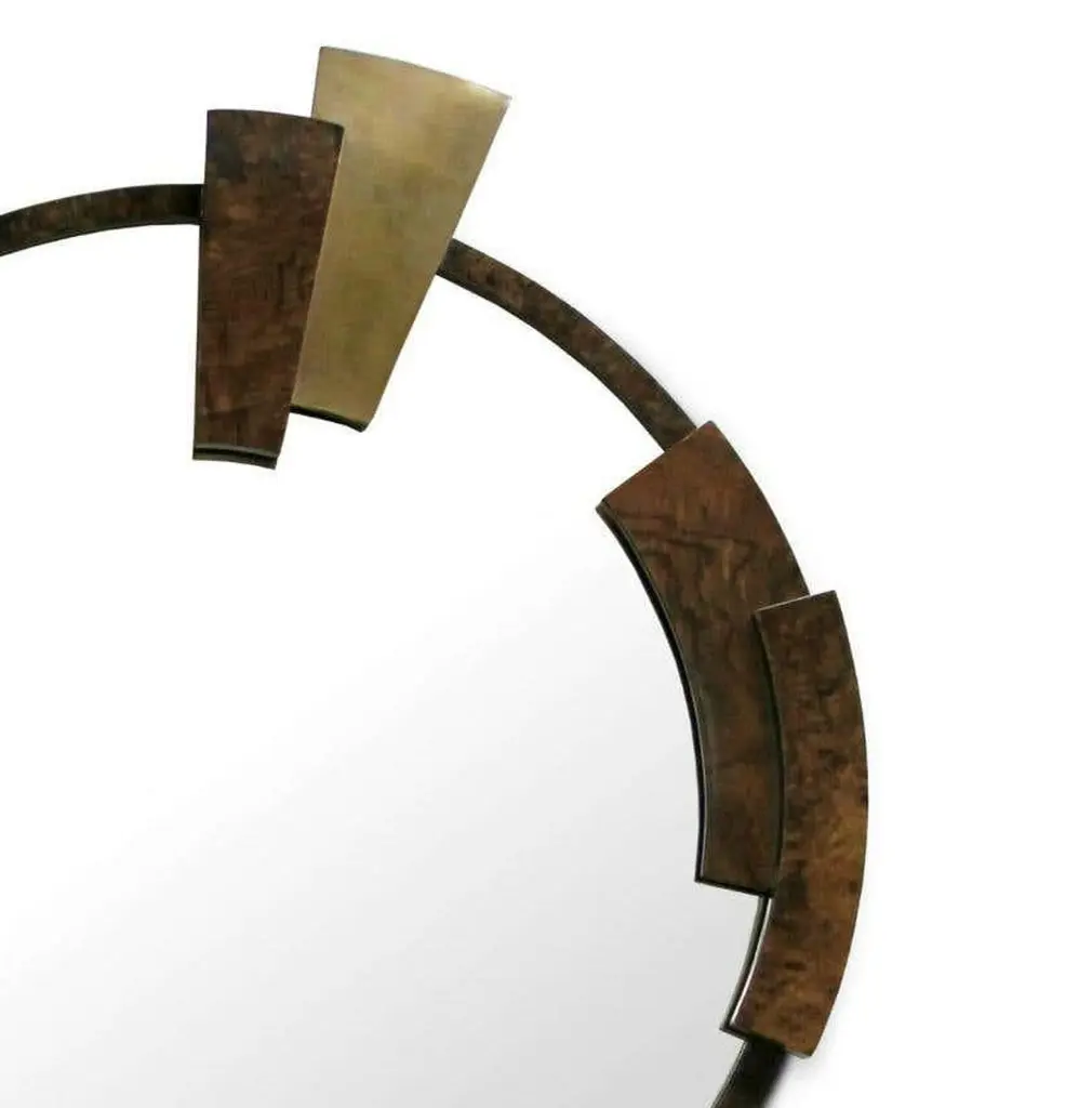 Mirror KandinskyGlossy walnut root veneer, glossy brass and copper, Flat mirror.Estimated production time: 8 - 9 weeksMeasures: Height: 140 cmWidth: 115 cmDepth: 8 cm.