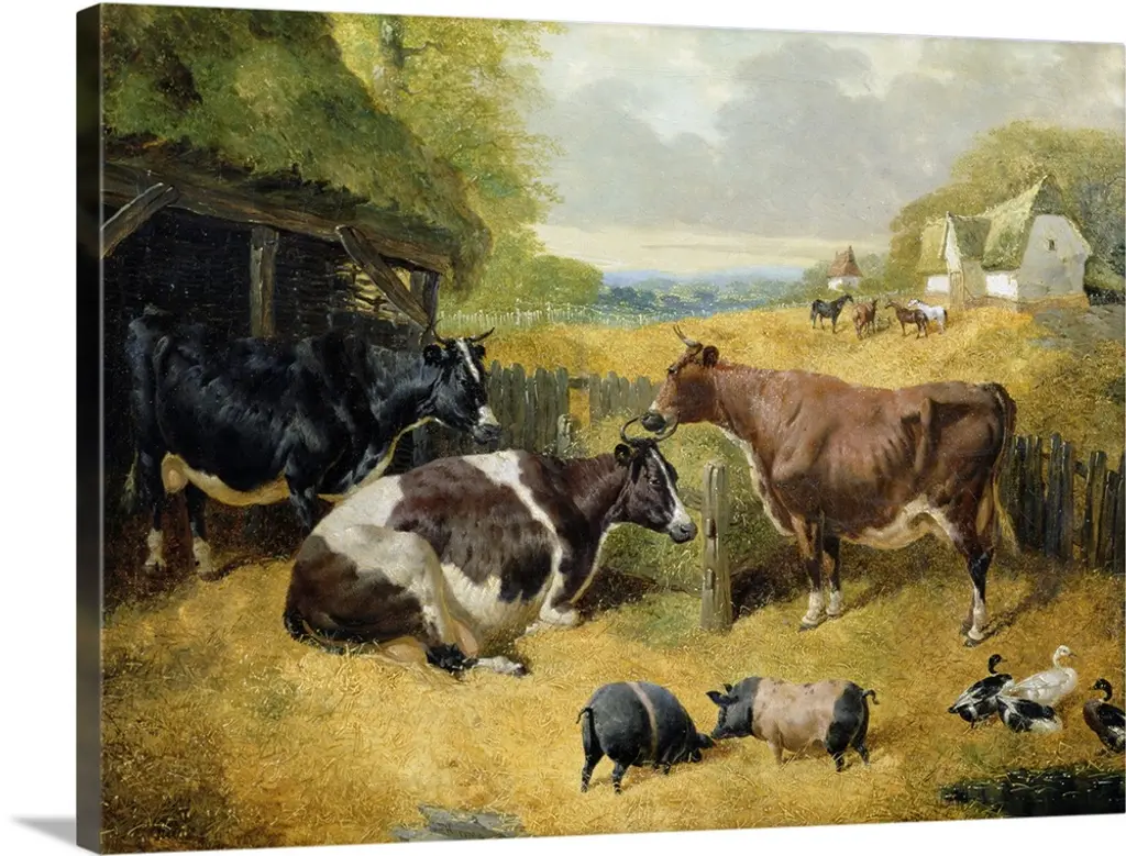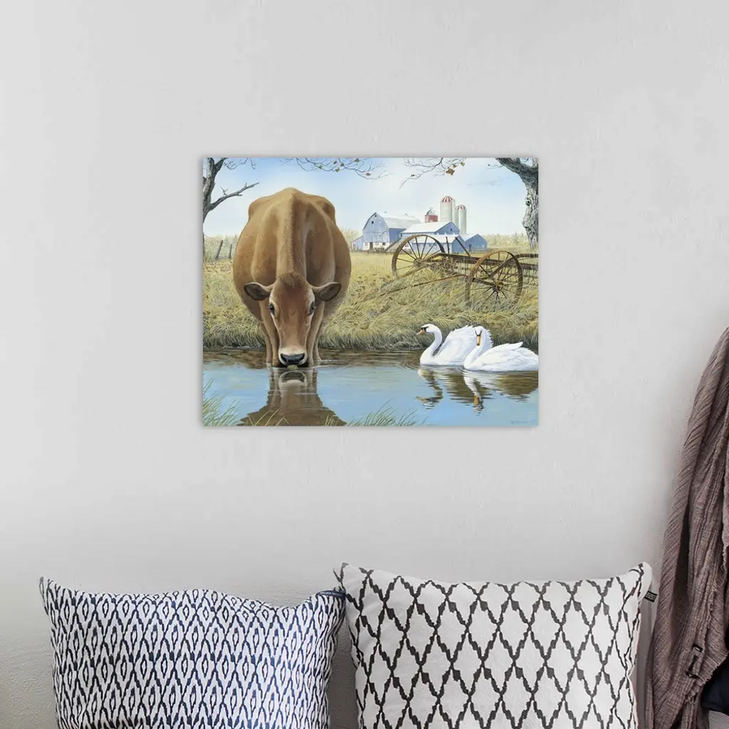 Contemporary painting of a cow drinking from a stream while swans float by.