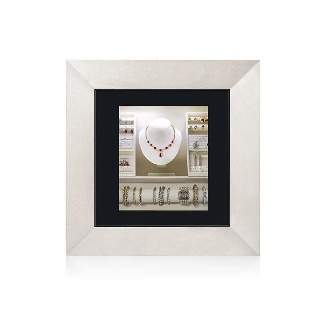 Safe with spy glass, options of different frames. This safe can be organized to display all types of collections and valuables. The mirror reflects when off. A mobile phone app can turn on the LED lights inside and open the door.