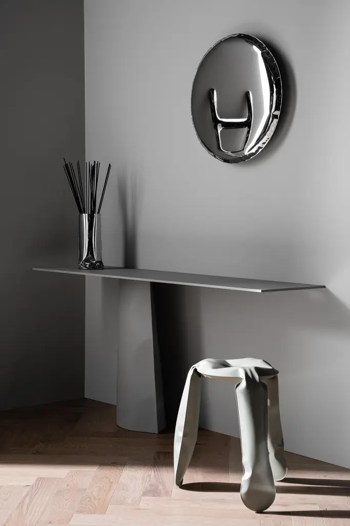 "OKO 75 contemporary mirror by Zieta(New model from 2020 collection)Stainless steelMeasures: 75 x 6 cm.Zieta is best known for his collection of stools “Plopp” made through the technologist Fidu. With the same principle Zieta Prozessdesign conceived mirror collections made of stainless steel called “Tafla”, “Rondo” and “Rondel”. Two laser-cut metal sheets are first welded together before air is injected between them until they separate from each other forming a three-dimensional object.Since he was a child, Oskar Zięta has been a huge fan of ultralightness and mobility. Today he is the creator of one of the lightest chairs on Earth, and a constant traveller between the universes of art and engineering. Throughout his life and career, Oskar has strongly believed in the power of determination and consistent perseverance in achieving goals. Success is a continuous search for your better self and better solutions—constant improvement and humility in the face of setbacks.