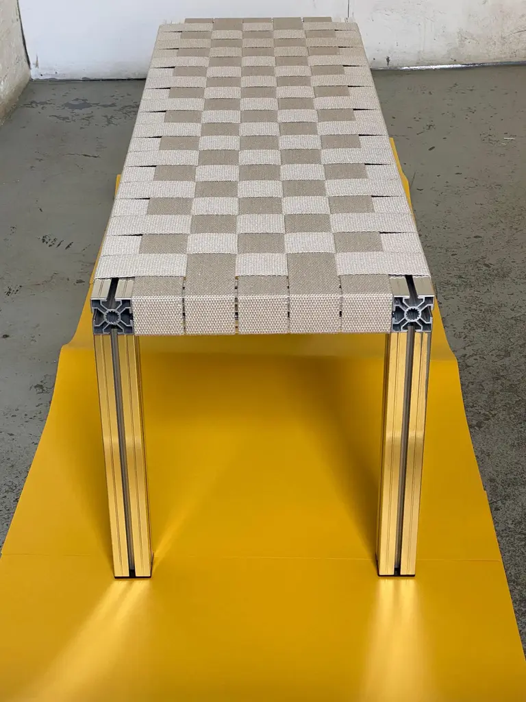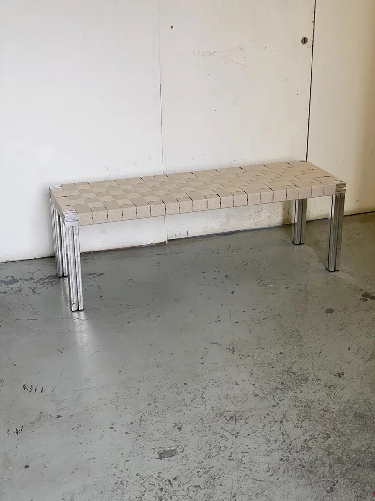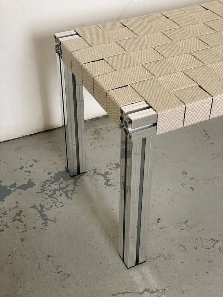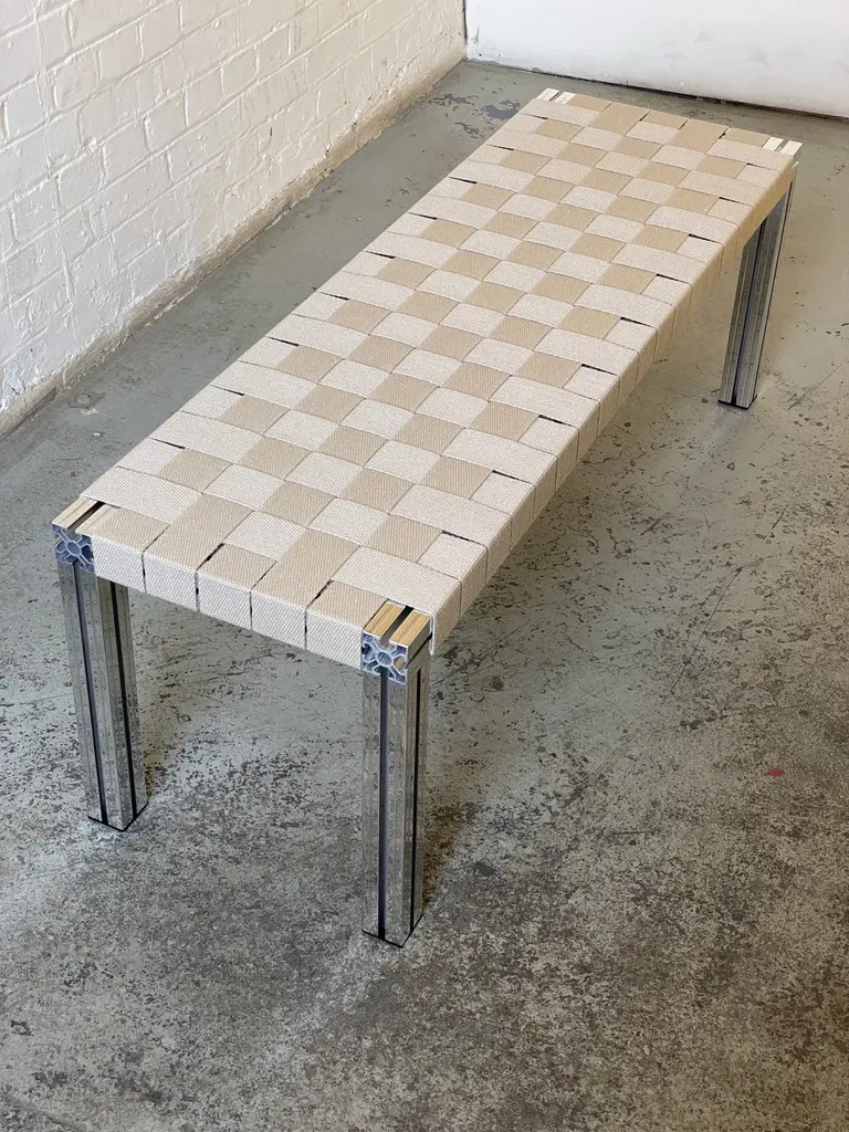 Originally realised for the Hepworth Gallery in Wakefield and inspired by Donald Judd and Børge Mogensen, Anodised Wicker marries industrially extruded and anodised aluminium with hand-woven cane wicker, rush envelope and flax webbing seats. The clinical and precise aluminium contrasts the warm and organic material. To this day we assemble the pieces in my studio in London and apply the cane, rush or webbing seating ourselves.The collection consists of this bench sized 1282mm x 408mm x 430mm (W x L x H) available with a Scandinavian flax webbing (this listing), woven glossy lapping cane seating or a reel rush envelope seating, a shorter stool also available with the same seating options and a cane woven armchair.The frame and legs can be mirror polished aluminium (this listing), powder coated (any colour) or anodised grey or in colour.