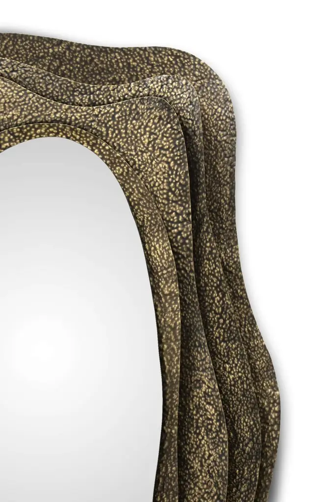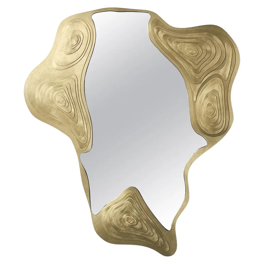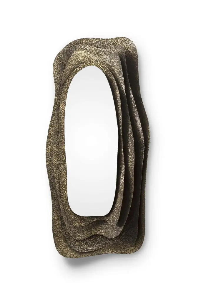 Mirror puddleGlossy hammered aged brass. Smoked mirror.Estimated production time: 8 - 9 weeksMeasures: Height: 180 cmWidth: 100 cmDepth: 17 cm.