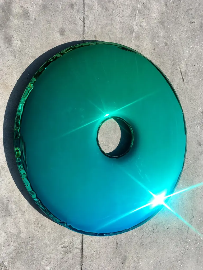 "Rondo 75" contemporary mirror by ZietaGradient collection: emerald + sapphire Original Zieta mirror, delivered with certificate. Stainless steelMeasures: 75 x 6 cm.Several finishes available: - Emerald- Saphire- Gradient of two colorsMore shapes and sizes are available (see picture attached). Zieta is best known for his collection of stools “Plopp” made through the technologist FIDU. With the same principle Zieta Prozessdesign conceived mirror collections made of stainless steel called “Tafla”, “Rondo” and “Rondel”. Two laser-cut metal sheets are first welded together before air is injected between them until they separate from each other forming a three-dimensional object.