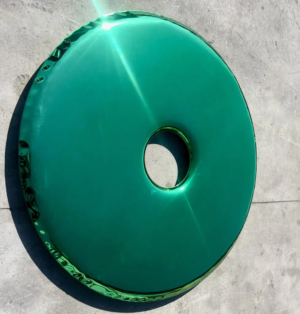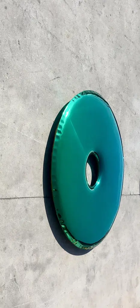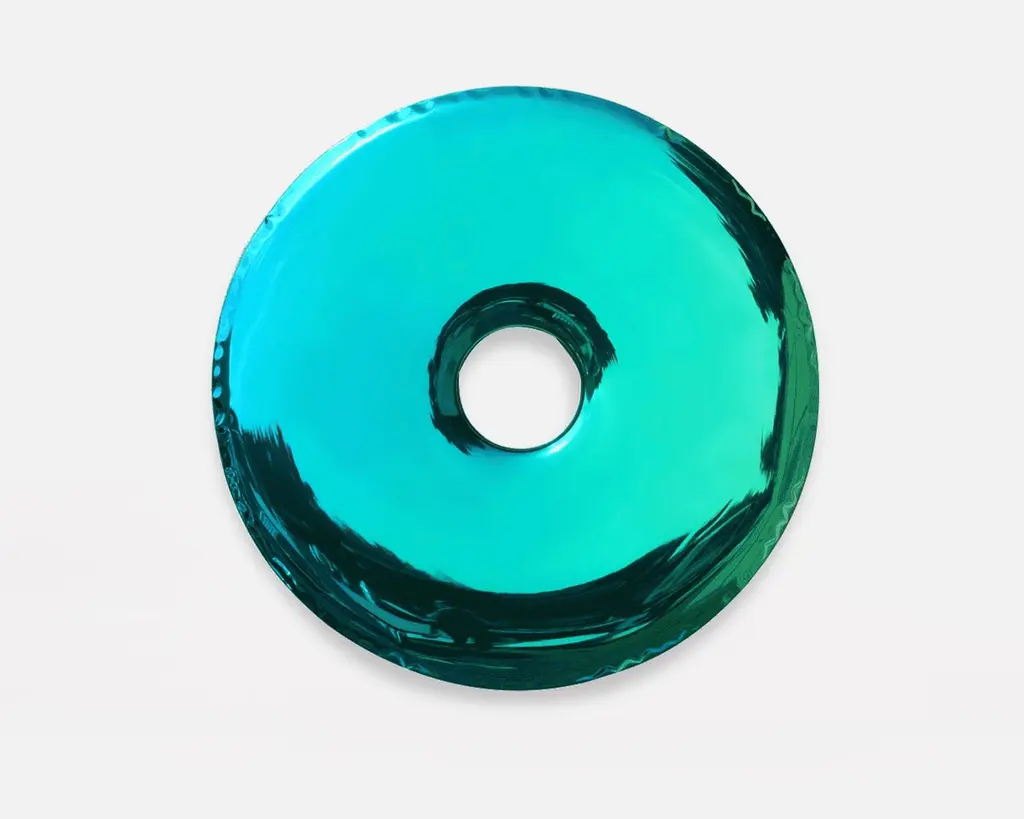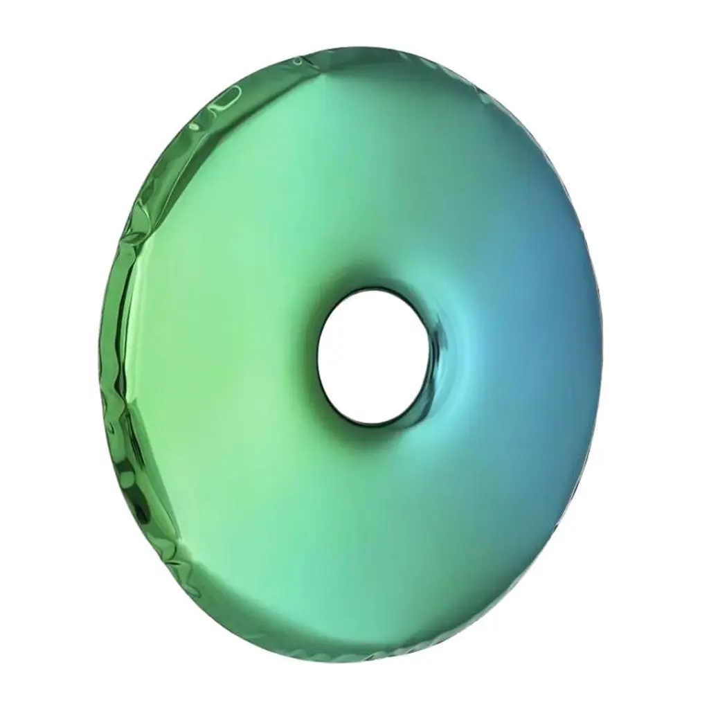 "Rondo 95" contemporary mirror by ZietaGradient collection: emerald + sapphireStainless steelMeasures: 95 x 6 cm.Several finishes available: - Emerald- Saphire- Gradient of two colorsMore shapes and sizes are available (see picture attached). Zieta is best known for his collection of stools “Plopp” made through the technologist FIDU. With the same principle Zieta Prozessdesign conceived mirror collections made of stainless steel called “Tafla”, “Rondo” and “Rondel”. Two laser-cut metal sheets are first welded together before air is injected between them until they separate from each other forming a three-dimensional object.
