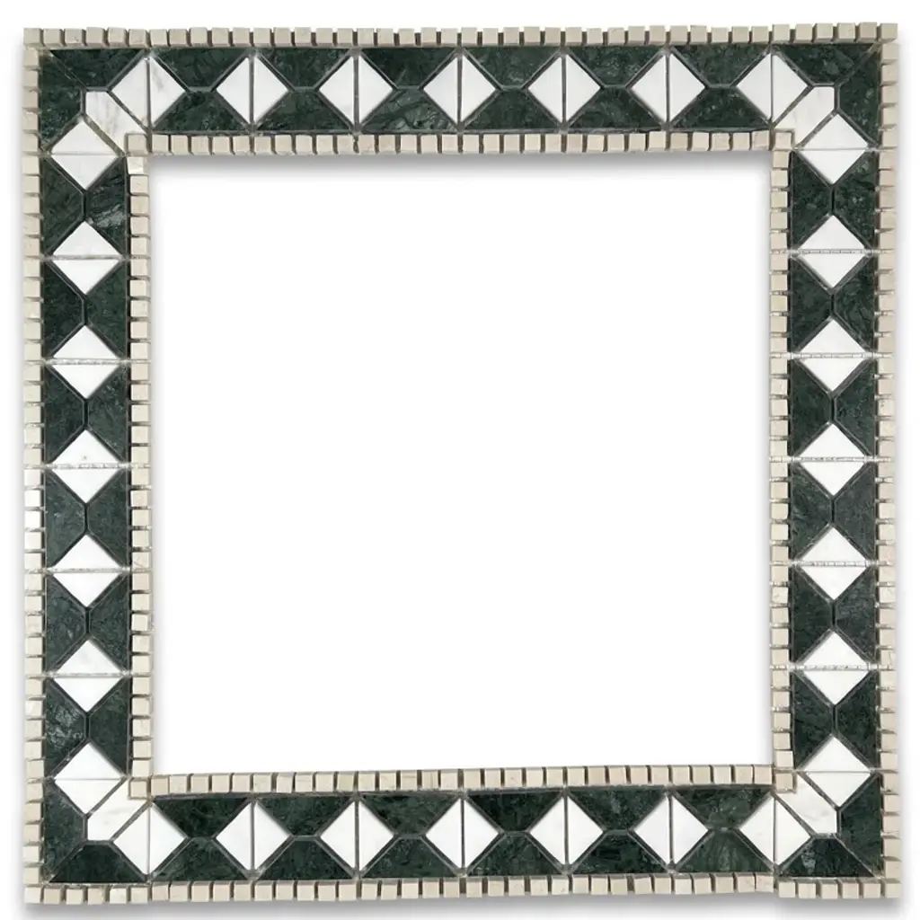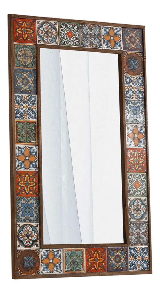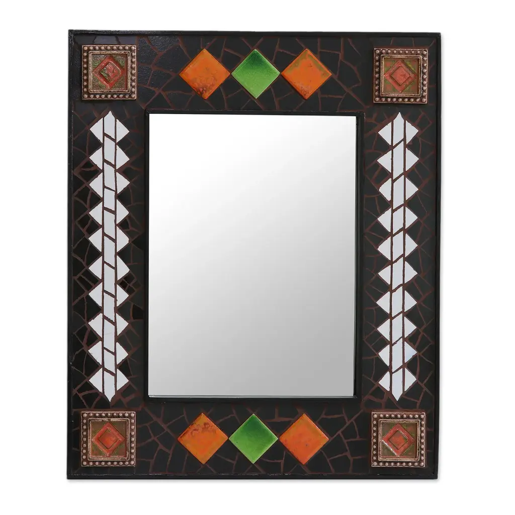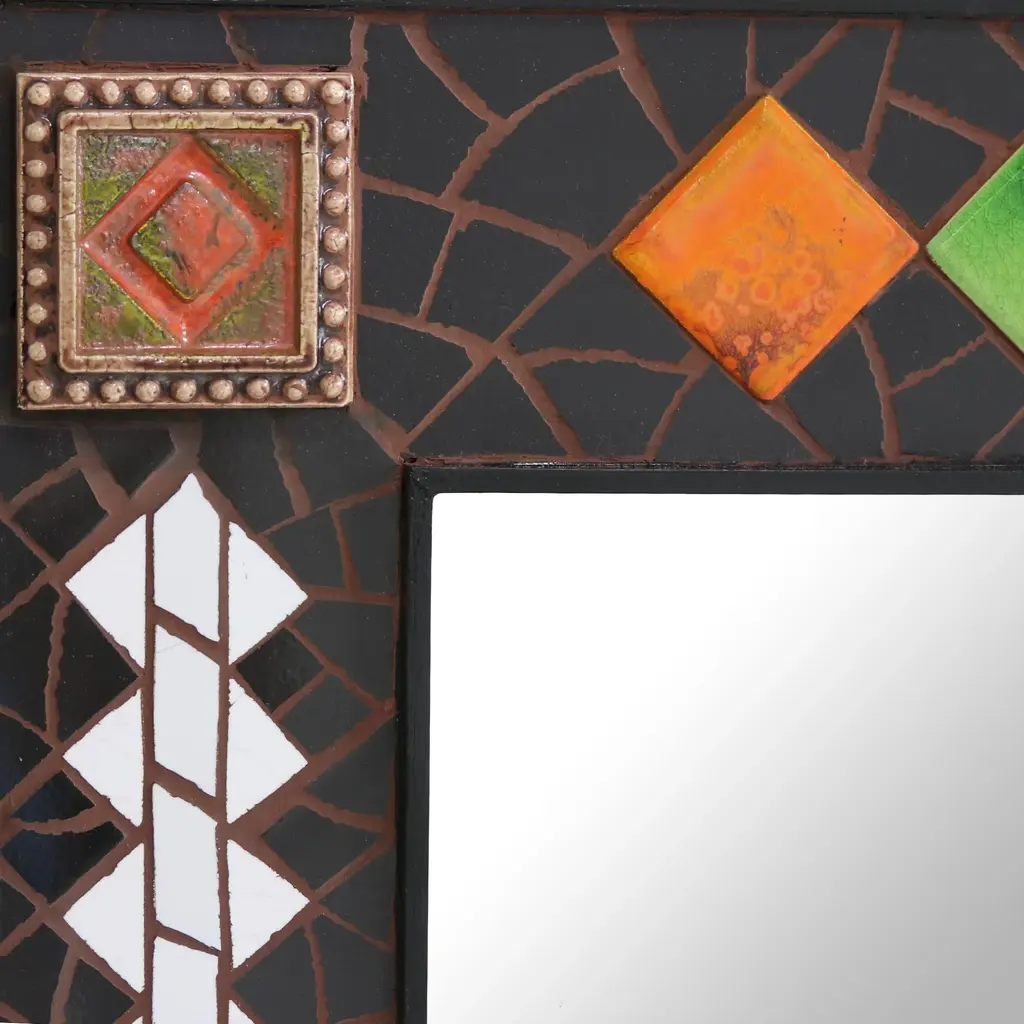 Working in ceramic mosaic, Lalit Sakhuja conjures a rain shower in a cascade of white tiles. Sunny orange and yellow flank green in this colorful design. The abstract images frame a bright, contemporary wall mirror.