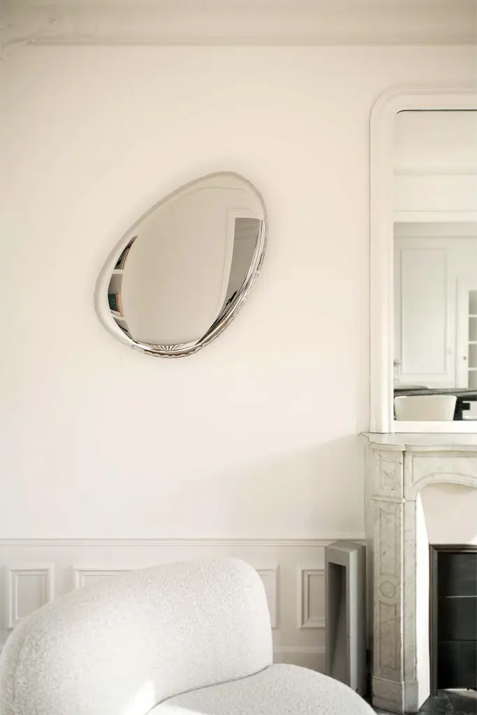Tafla O4.5 contemporary mirror by Zieta.(New model created in 2020)Delivered with certificate signed by the artist: Oskar Zieta for Zieta Studio.Polished stainless steelMeasures: 86 x 57 x 6 cm.Zieta is best known for his collection of stools “Plopp” made through the technologist Fidu. With the same principle Zieta Prozessdesign conceived mirror collections made of stainless steel called “Tafla”, “Rondo” and “Rondel”. Two laser-cut metal sheets are first welded together before air is injected between them until they separate from each other forming a three-dimensional object.--Mirrors designed by Zieta Studio are not just objects that reflect reality and adorn the interior, amplifying it optically. Such objects as TAFLA O are tridimensional designer’s mirrors worth the best contemporary living spaces. TAFLA metal mirrors come in numerous shapes and sizes: from large round mirrors to geometric smaller sculptural forms. TAFLA O, TAFLA C and TAFLA Q are artistic variations of the same concept – of creating a decorative sculptural mirror out of inflated steel using FiDU technology. Some of them are characterized by a minimalist simplicity and respect for proportions, some are distinguished by a soft line of organic form. There is such a diversity that arranging them together reminds of storytelling. Would it be a story of water drops or pieces of shattered glass immortalized on the wall – it is the question of space and imagination.Special qualities of the TAFLA O mirror:They are destined to be composed into fantastic wall decorations – it’s up to you, what kind of installation you will create on the wall. While a single TAFLA mirror makes a statement in the interior, multiple TAFLA mirrors in various sizes and shapes add even more style to it. Style and intended use:TAFLA O is a series of bionic mirrors of organic shapes inspired by natural shapes of liquid drops – some will say they resemble mercury drops in a macro-scale. TAFLA O mirror comes in seven different sizes – it can be arranged in an artistic personalized composition or exposed on a wall as a single sculpture-like mirror. It will fit contemporary private spaces, as well as restaurants, bars and hotel rooms.Materials:Mirrors from the TAFLA collection are made of stainless steel polished to a high gloss.Important facts:On the polished surface of the TAFLA mirrors, all steel refractions are perfectly visible – the artistic effect of the "controlled loss of control" process of shaping their form. Each convexity visible on this wall mirror’s surface is unique – because steel never deforms in exactly the same way.