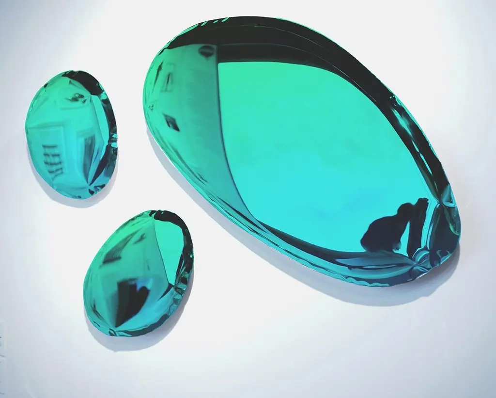 "Tafla O5" contemporary mirror by ZietaGradient collection, sapphire blueOriginal Zieta mirror, delivered with certificate.Stainless steelMeasures: 60 x 40 x 6 cm.Several finishes available: - Emerald- Sapphire- Gradient of two colors- Deep space blueMore shapes and sizes are available (see picture attached). Zieta is best known for his collection of stools “Plopp” made through the technologist FIDU. With the same principle Zieta Prozessdesign conceived mirror collections made of stainless steel called “Tafla”, “Rondo” and “Rondel”. Two laser-cut metal sheets are first welded together before air is injected between them until they separate from each other forming a three-dimensional object.