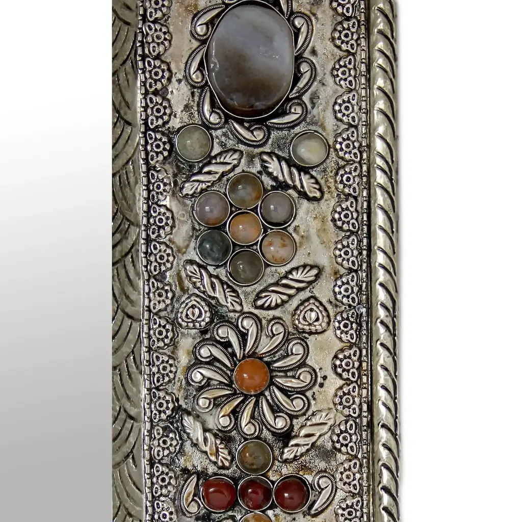 Khalid Ali evokes a vintage treasure with this beautiful wall mirror. Crafted by hand, the graceful frame is covered with repoussé flowers in embossed brass bathed in nickel. It is inlaid with colorful glass beads and backed with velvet.
