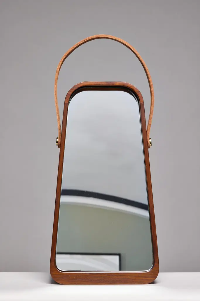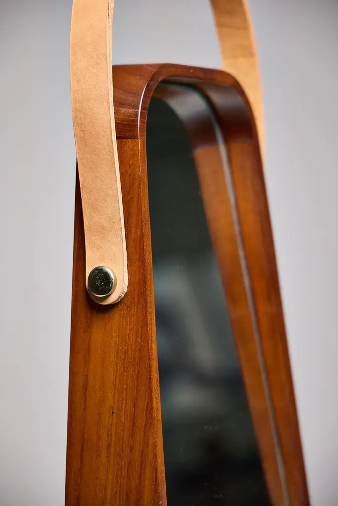 Table mirror. Wood frame and fixed tilted miroir integrated.Teakwood in Natural waterbase finish.Mirror glass 5mm / Mirror anse in natural Leather.Dimensions: 269 x 95/45 x h500 mmThis product is handmade. Each piece is unique, and may vary slightly in color from one object to another. This is what confers its handmade character.